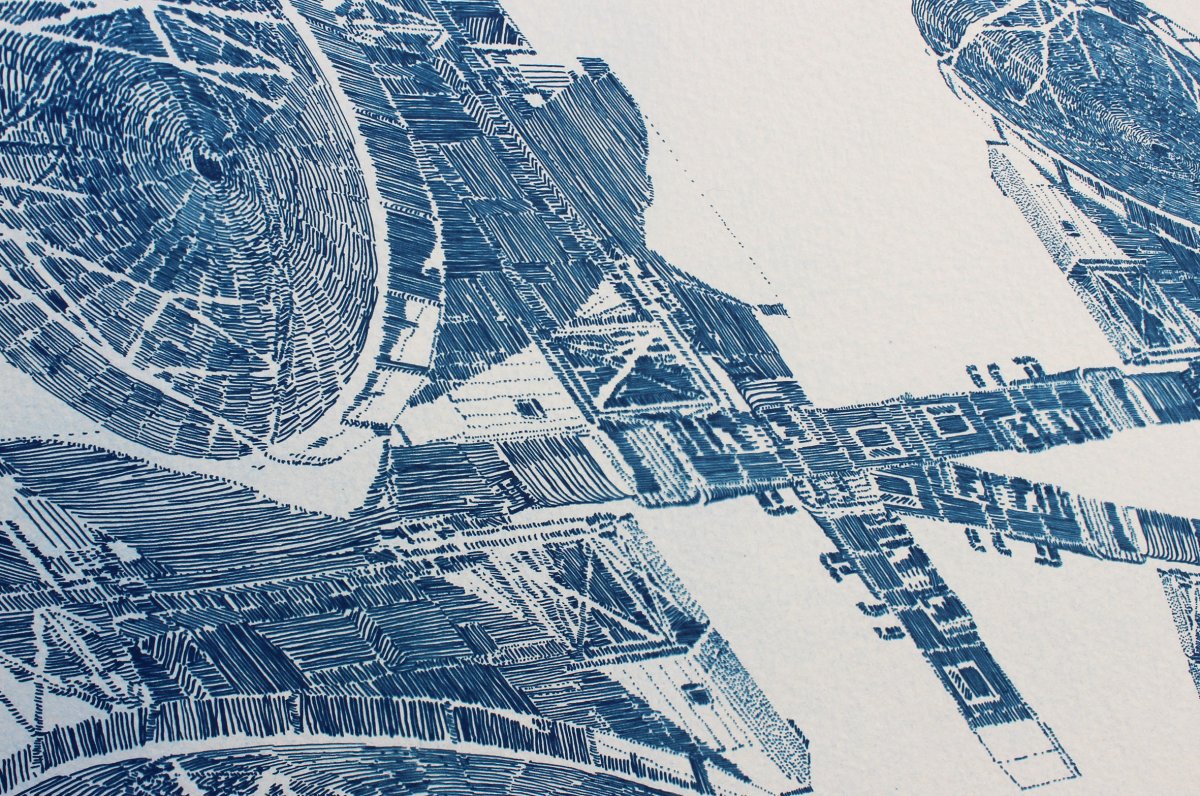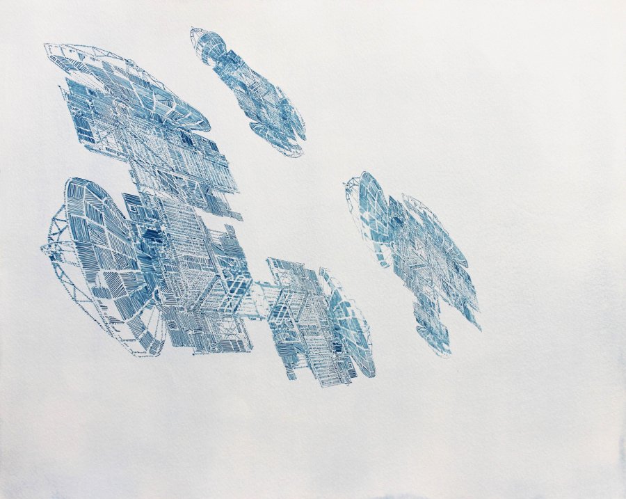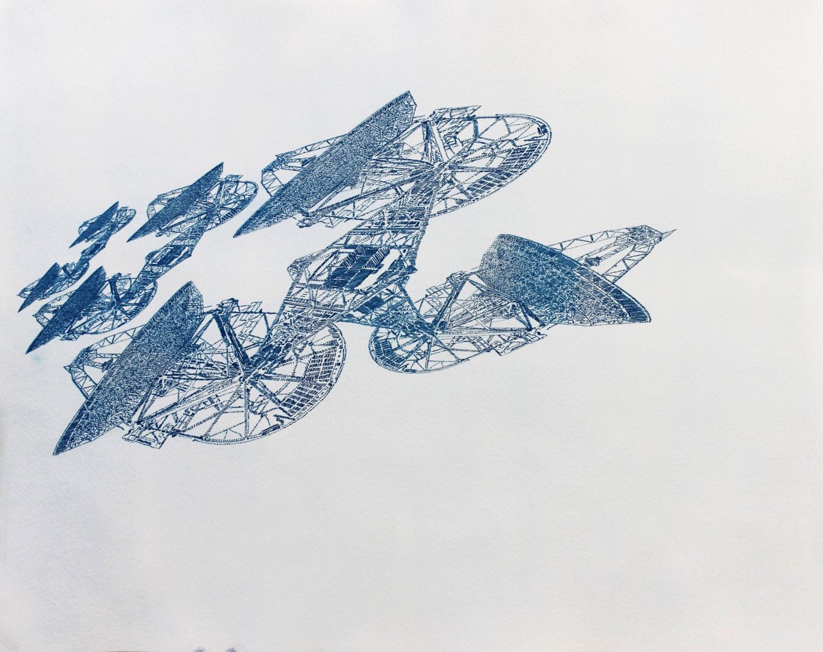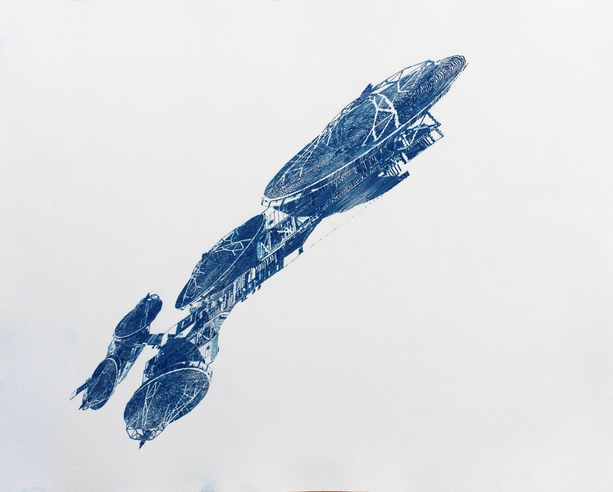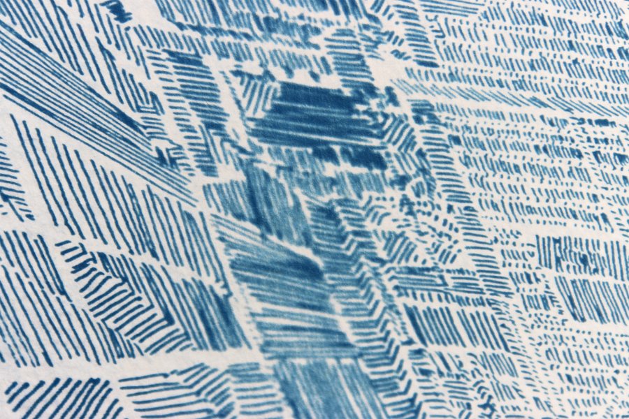 Dessiné à la main, numérisé, puis déformé par une action numérique et retranscrit par le cyanotype, sur papier Montval