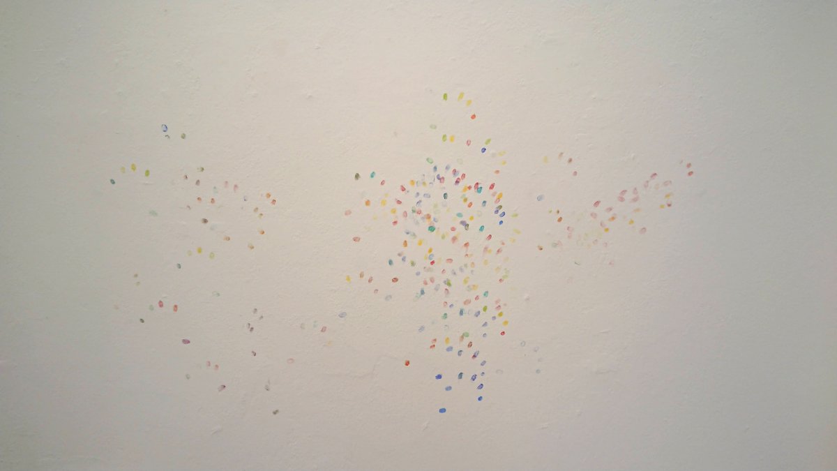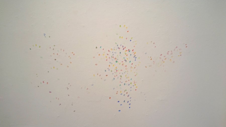 Des traces de doigts forment une fresque colorée inspirée par les dessins à l’aveugle de Robert Morris.