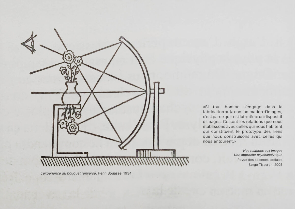 Tout paraît alors évident : les bouquets, les plantes, les couleurs, la référence à la peinture de nature morte. Cependant, l’image qu’on se fabrique des choses racontent plus que les choses en elles-mêmes. Alors transformer ces bouquets en images, rappelle l’analogie que Lacan fait entre l’analyse et le schéma optique du bouquet renversé. Ce schéma optique est une illusion qui rassemble dans le reflet d’un miroir concave deux objets séparés, le vase et les fleurs. Dans mon travail, rien n’est séparé. La sensation d’illusion est présente par les déformations de l’arrondi du vase, l’effet loupe de l’eau, l’aplatissement de la photographie, le flottement de l’objet sur le fond et par l’étrangeté de la lumière.