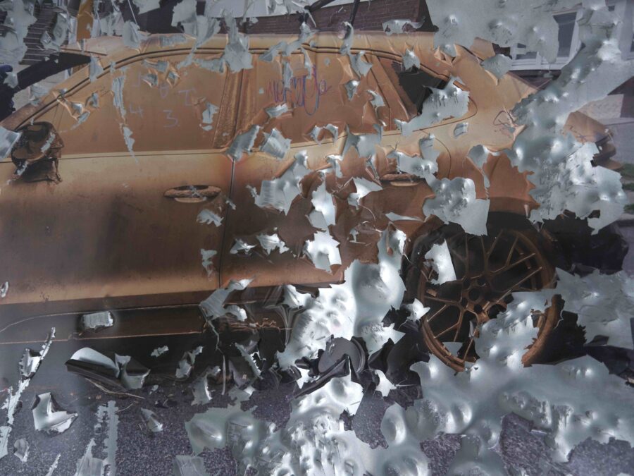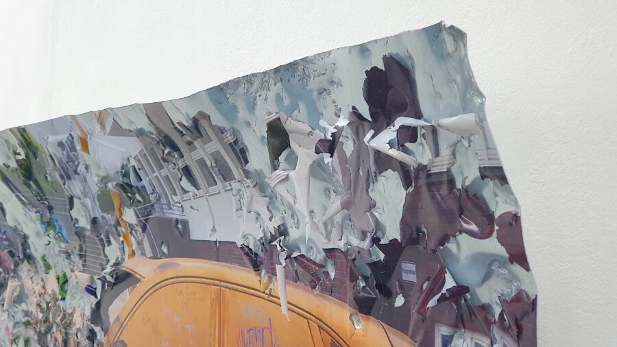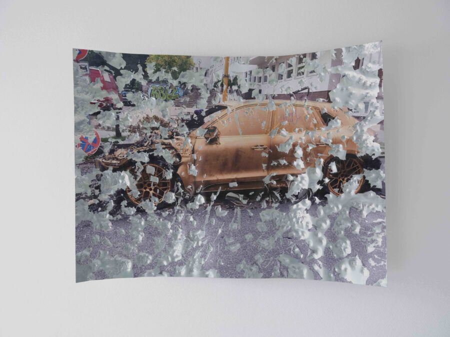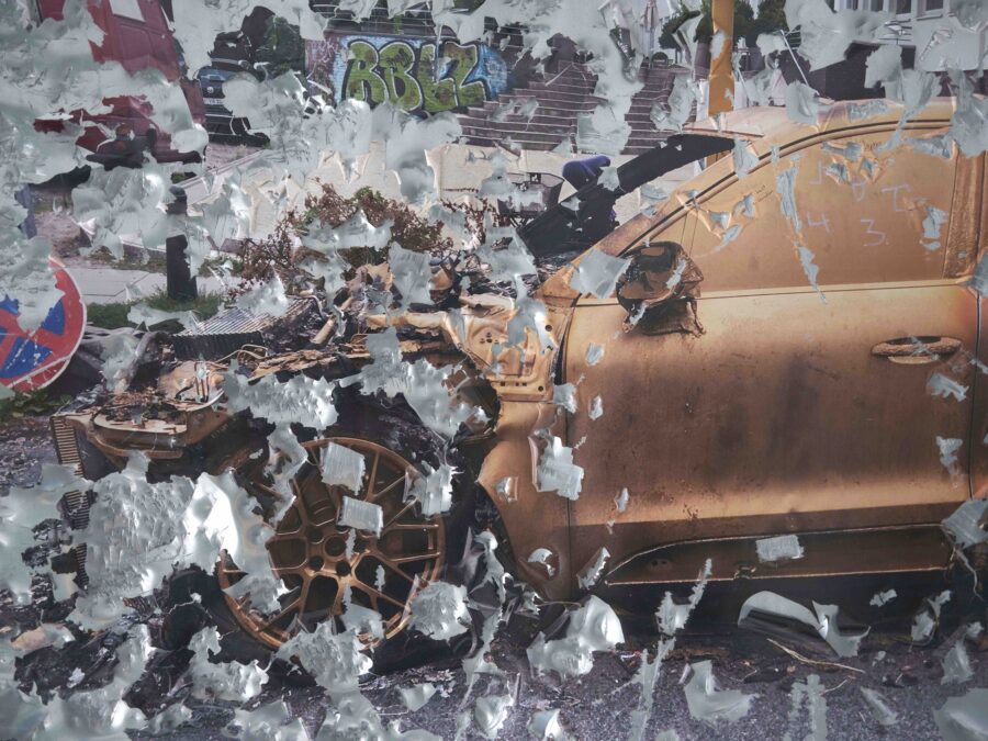Cette photographie est prise dans le cadre d’une prospection à Hambourg. J’y découvre une voiture de luxe, fraichement brûlée, calcinée, encore odorante et repeinte à la bombe d’une couche de peinture couleur or.
