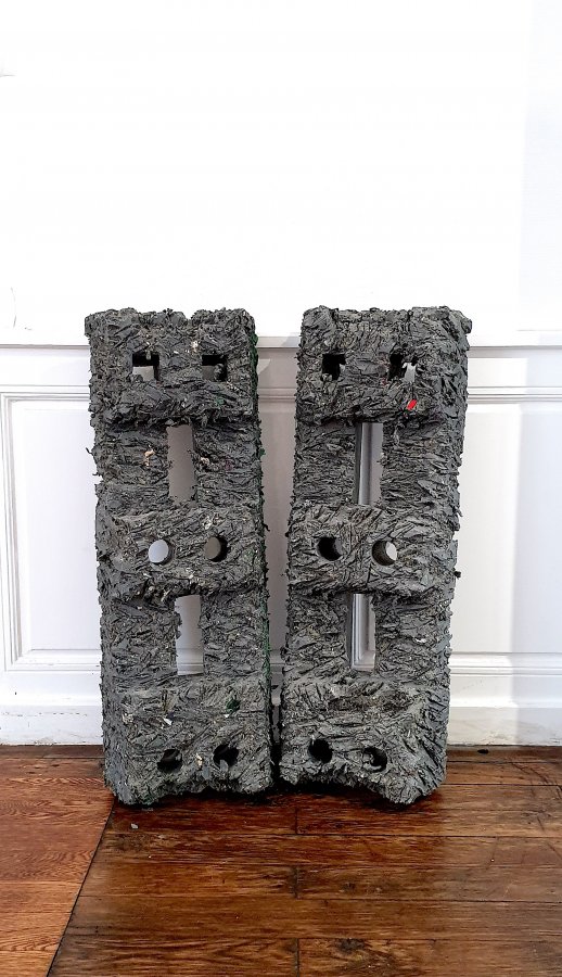 C’est une photographie prise dans le cadre d’une prospection à Hambourg. J’y découvre une voiture de luxe, fraichement brûlée, calcinée, encore odorante et repeinte à la bombe d’une couche de peinture couleur or. Je m’approprie cette métamorphose, cette action anonyme, radicale et volontaire par l’impression de cette photographie sur une plaque d’acier galvanisée et par l’action de marteler celle-ci à même l’image au marteau m’attaquant ainsi à la représentation, à la documentation de cette action. Par une mise en abime, je réalise non plus une trace mais une oeuvre à part entière issue d’une action, par une action. Celle-ci participe d’un processus de réflexion et de mise en oeuvre au sujet du statut de la documentation et de la représentation de la performance.
