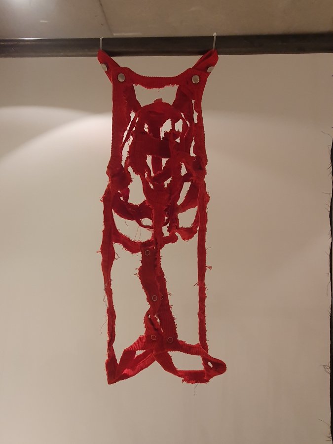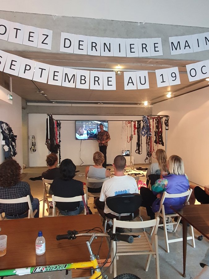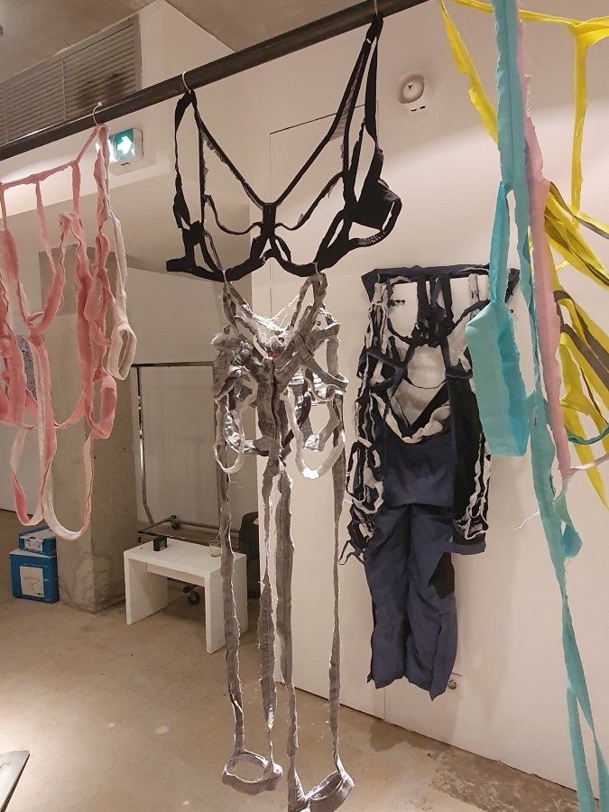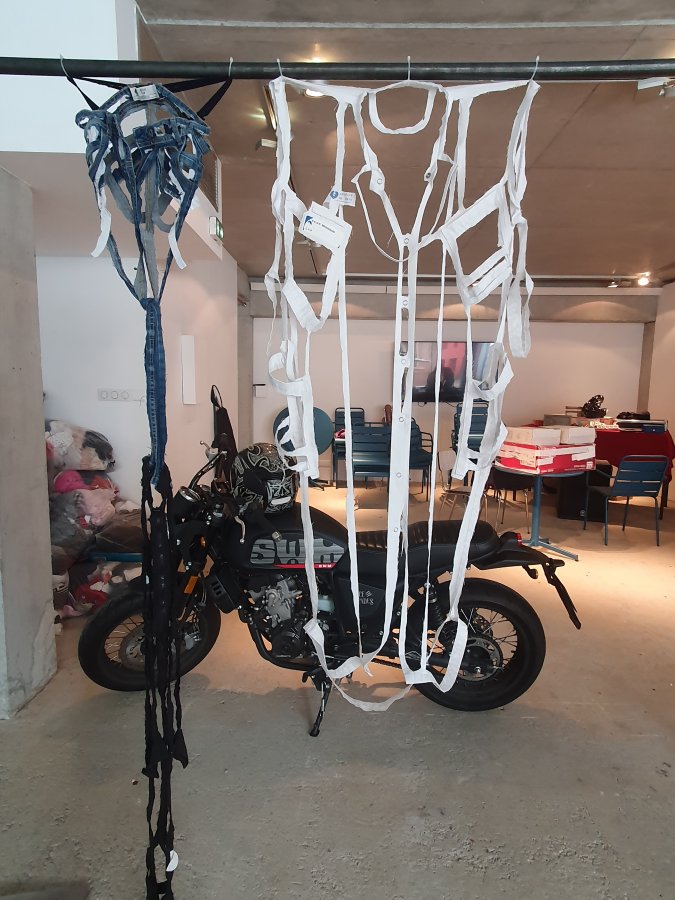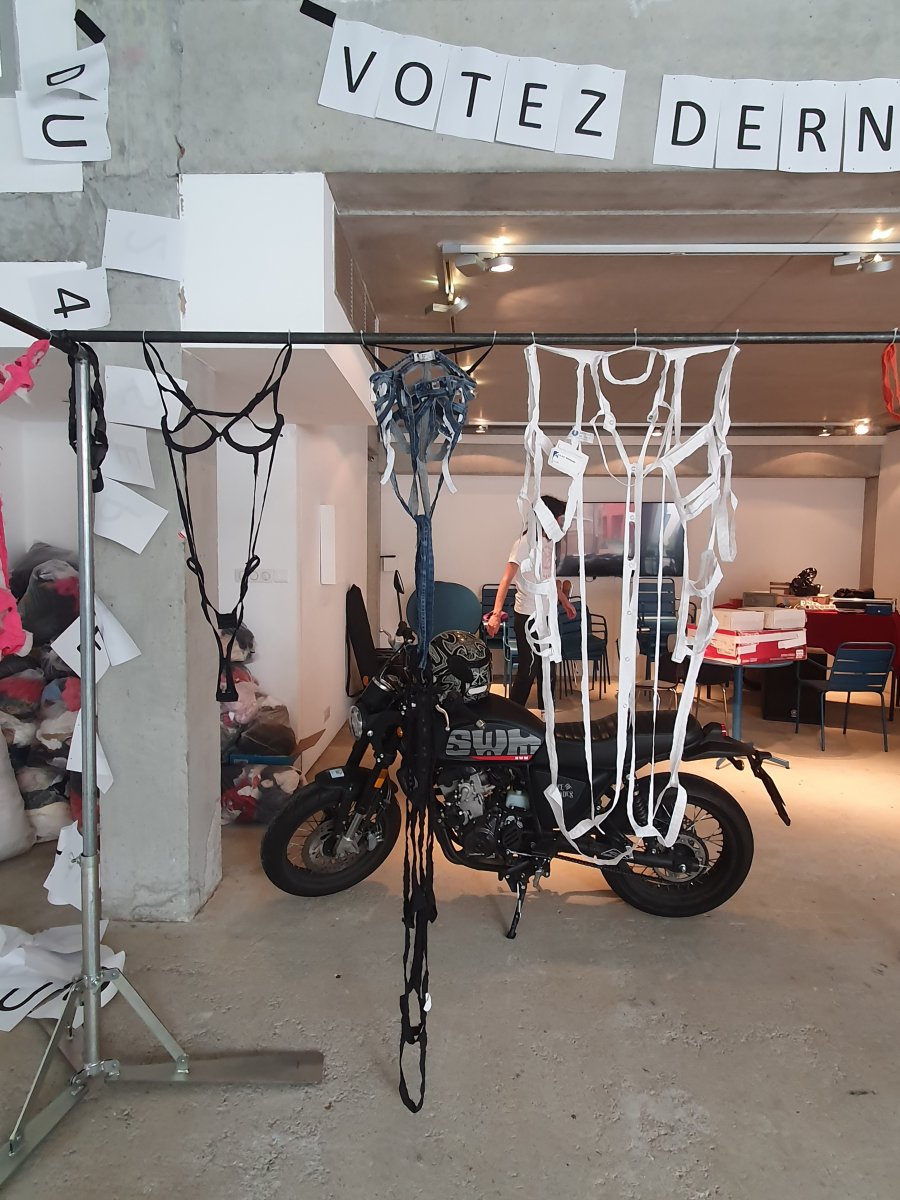 Ces habits de récupérations ont déjà migrés / d’une ville à une autre / d’une situation à une autre / vêtements quotidiens / vêtements professionnels / passant par un entrepôt du Point-Relais / par une ressourcerie / déjà portés et emportés / par camion / une caisse de conditionnement / un sac à dos / un recyclage hybride / la durée de la découpe / le temps de l’imaginaire / la pensée à l’œuvre du désœuvrement / une action / une installation éphémère / dessin par le vide / ne conservant que la structure / le squelette / les coutures / traces de fabrications anonymes / créer du dialogue / laisser ouverte la réception / résonner avec le contexte de mouvements activistes et manifestations
