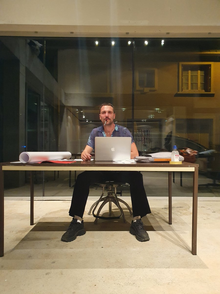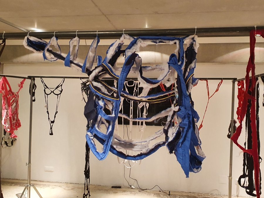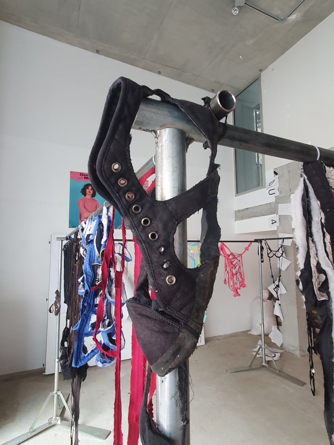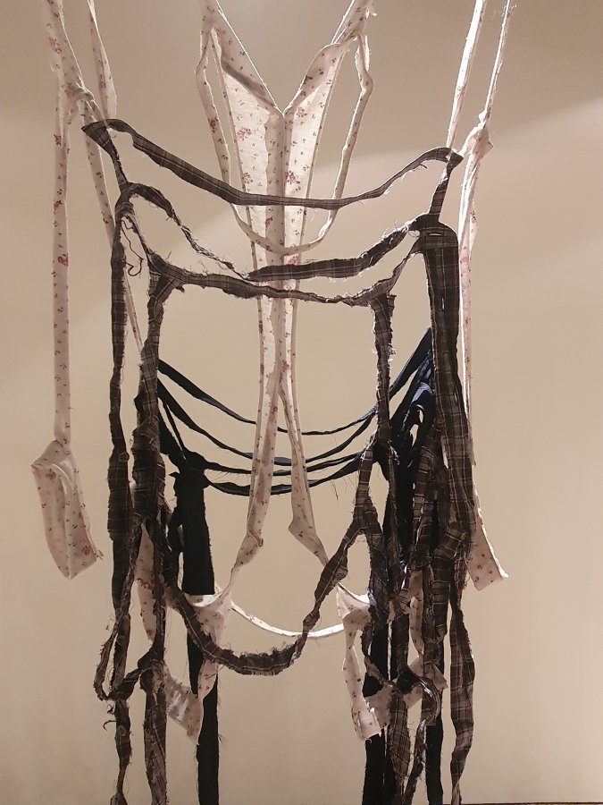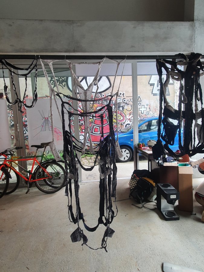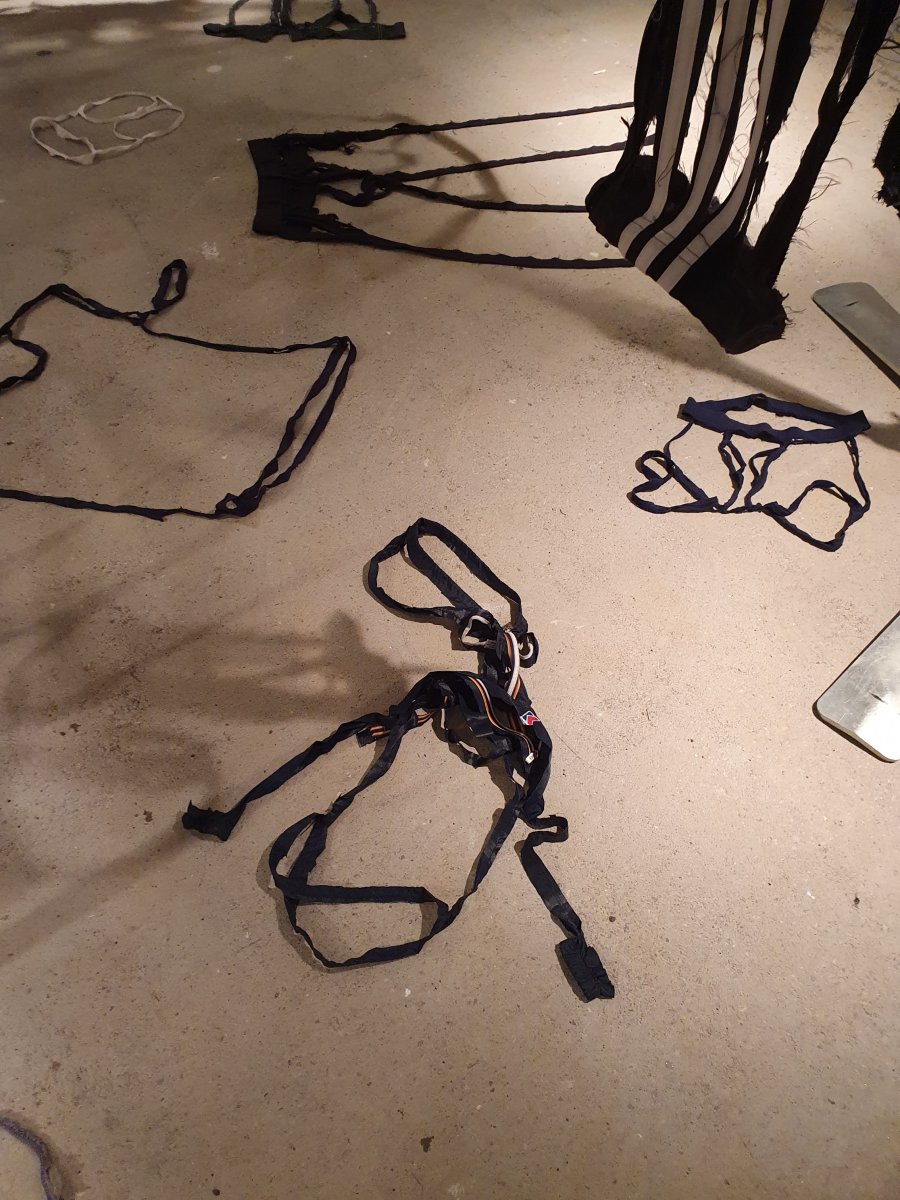 Ces habits de récupérations ont déjà migrés / d’une ville à une autre / d’une situation à une autre / vêtements quotidiens / vêtements professionnels / passant par un entrepôt du Point-Relais / par une ressourcerie / déjà portés et emportés / par camion / une caisse de conditionnement / un sac à dos / un recyclage hybride / la durée de la découpe / le temps de l’imaginaire / la pensée à l’œuvre du désœuvrement / une action / une installation éphémère / dessin par le vide / ne conservant que la structure / le squelette / les coutures / traces de fabrications anonymes / créer du dialogue / laisser ouverte la réception / résonner avec le contexte de mouvements activistes et manifestations