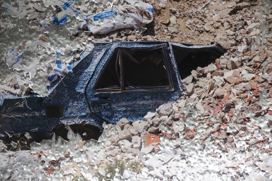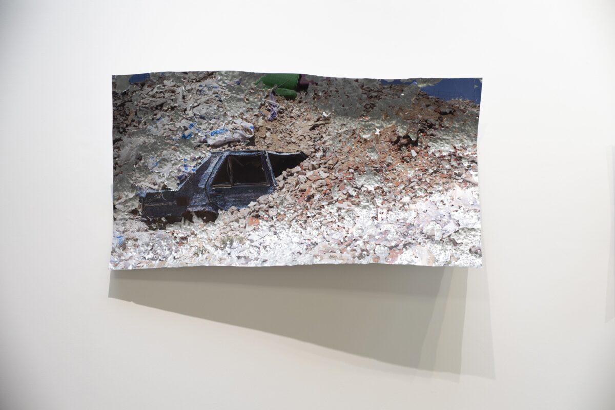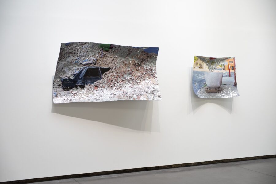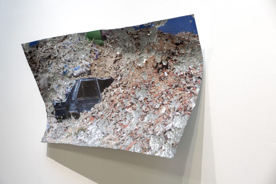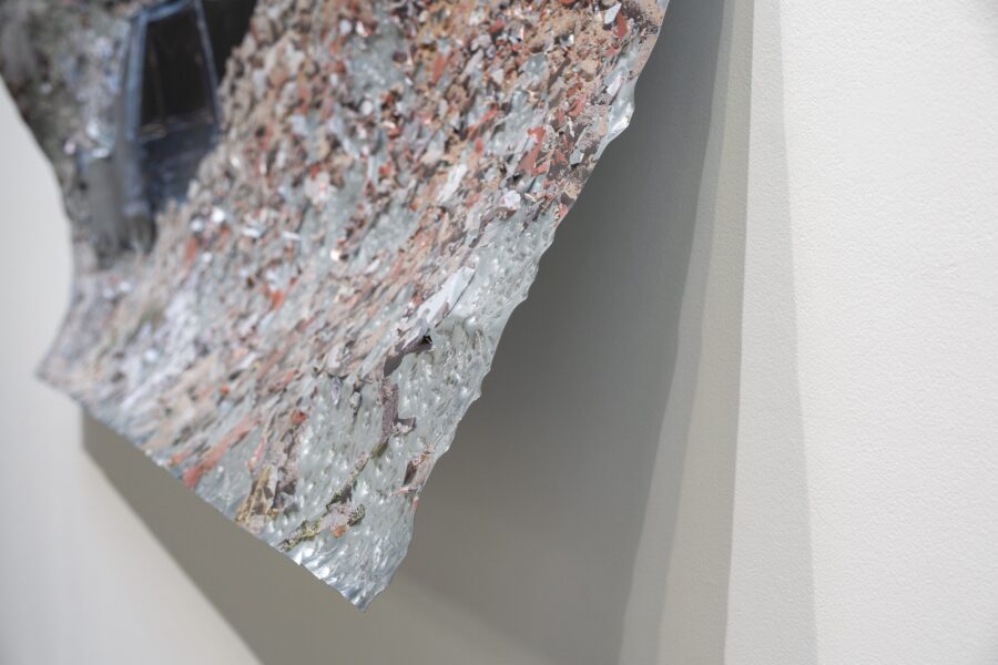 Comment donner à voir une action qui à eu lieu dans le paysage au delà de sa documentation photographique ? Impacter le support photographique lui-même: marteler, ébrècher la photographie à même le support. Interroger la notion de traces et de documentation d’une action performative.