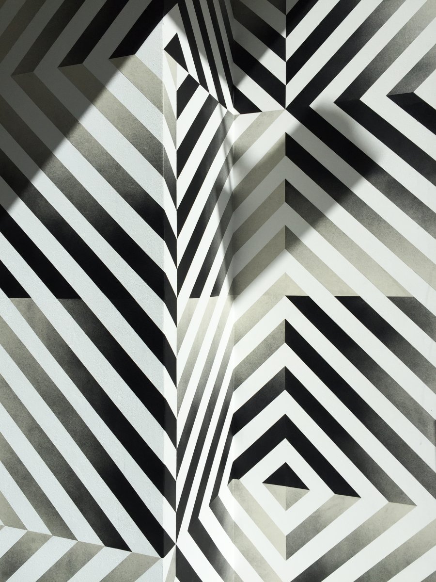 Ces papiers peints modulaires pensés initialement comme des dessins dans l’espace, peuvent aussi se lire comme une pratique de peinture. L’idée c’est de les réaliser à la mesure du lieu, à l’échelle. Les papiers peints « collent » au lieu, ils sont si proches de la surface qu’ils recouvrent qu’ils en font visuellement partie. Je les conçois comme des partitions, ils mettent en œuvre une écriture, à divers niveaux de lectures.