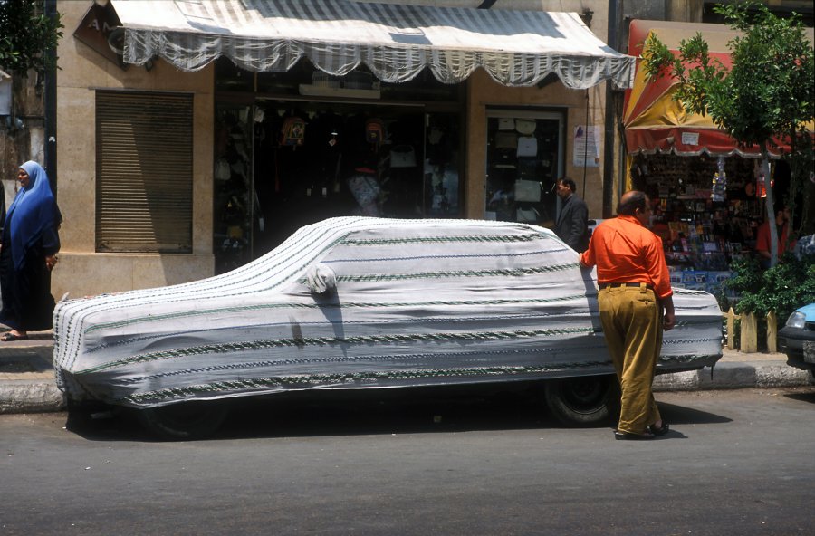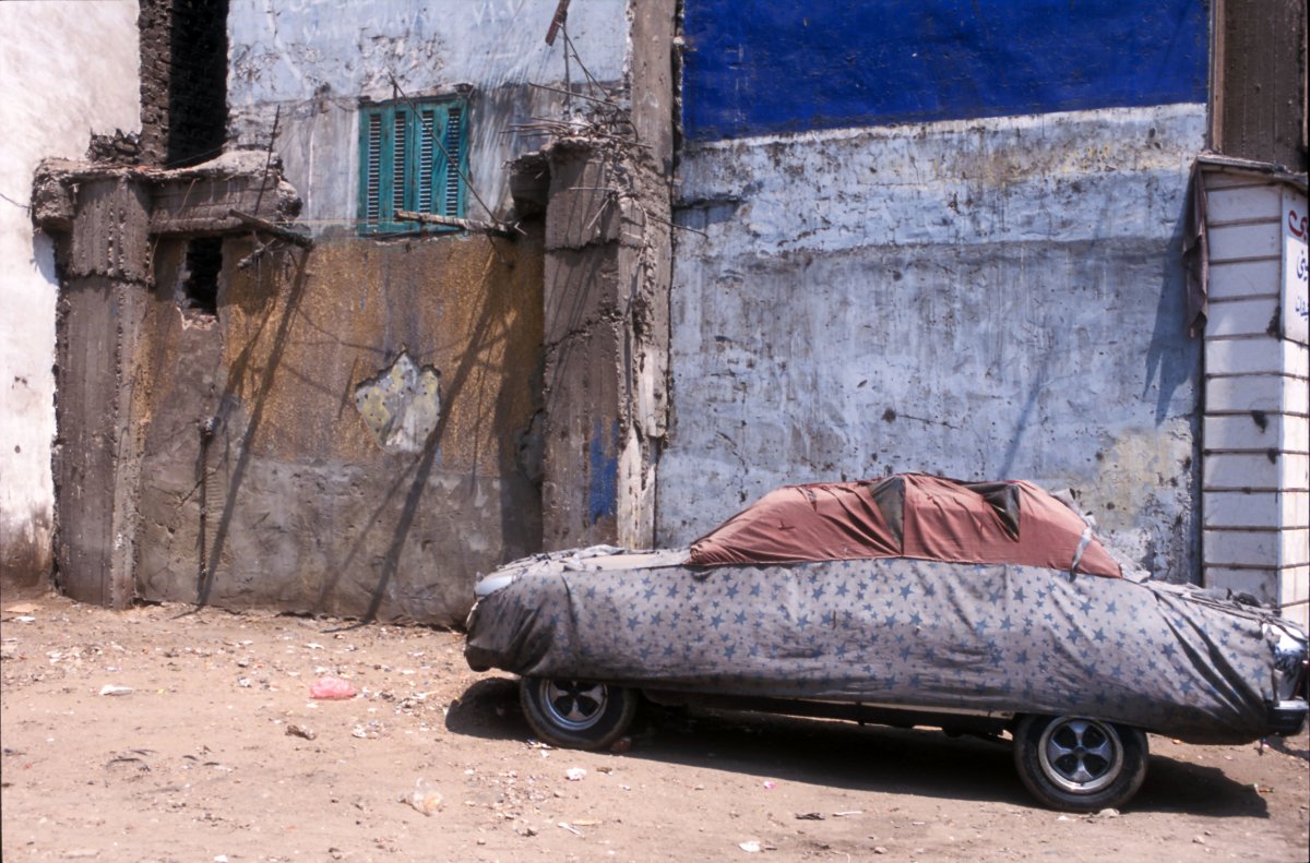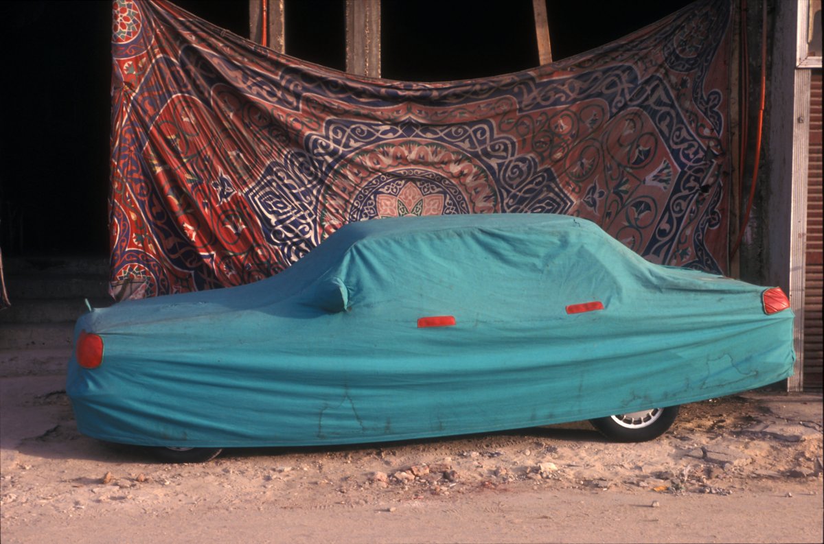 Au cours d’un voyage en Égypte, j’ai remarqué ces bâches recouvrant des voitures en stationnement. Trouvant le phénomène trop récurrent pour ne pas être cocasse, j’en photographiai quelques-unes. À mon retour en France, j’ai découvert mes images sur la table lumineuse. J’ai alors jubilé : Ces voitures bâchées, une fois enfermées dans le rectangle de la photo, prenaient une dimension que je n’avais pas pressentie lorsque je les avais vues pour la première fois. Elles avaient pris une signification qui leur était propre, dans un cadre plus épuré. Elles devenaient des personnages drapés de couleurs, de vie, d’humour, d’histoire et d’histoires.