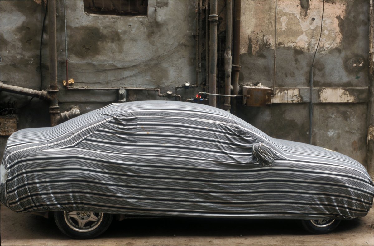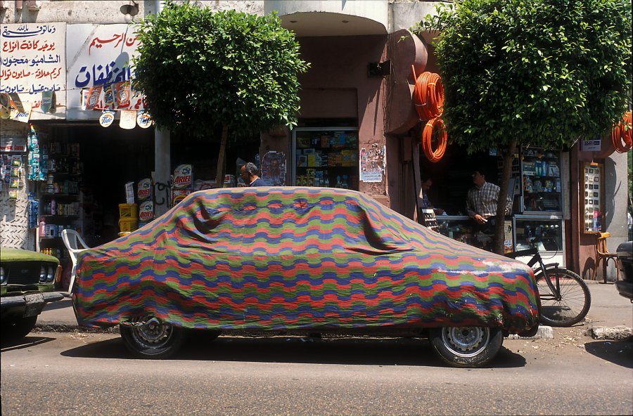 Les bâches, utilisées pour protéger de la poussière, des éraflures, et même du regard des autres, sont chacune unique, fabriquées dans des tissus aux couleurs et aux motifs divers. Au fil du temps, l’usure oblige les propriétaires à les rapiécer, qui créent parfois de véritables patchworks. Affublée de son voile, la voiture quitte son rôle, elle n’est plus « l’objet de grande consommation », ni la simple illustration de la « vie moderne ». Elle se départit de son caractère masculin, ne porte plus les lourds devoirs de puissance ou de richesse que son propriétaire lui impose d’ordinaire. Ici, dissimulée sous sa toile personnalisée, elle devient ludique, séduisante, féminine et a soudain l’autorisation d’être témoin du temps qui passe. Sur les trottoirs d’Egypte, on vend toutes sortes de choses, des journaux, des livres, des bibelots et aussi, de chatoyants foulards. Si les femmes, musulmanes, sont traditionnelles, il leur reste une fantaisie à s’offrir, une mode à suivre, celle du foulard bigarré, le fleuri, le léopard, le rayé, l’uni… Le rapprochement est simple à faire, et pour moi, il est évident même si les démarches respectives sont inconscientes. Et quand on veut faire le portrait intime d’une femme, on choisit de la photographier dans son endroit préféré, avec les objets qui parleront pour elles et avec elles`. Les voitures bâchées appartiennent aux rues turbulentes des villes, à leurs marchés impromptus, aux scènes insolites qui s’y déroulent, à leurs décors de théâtres délabrés. La voiture y est une actrice parée, dont la robe et la scène accompagnent l’identité. Une harmonie s’installe, née de l’alliance du modèle et de sa toile avec les petits détails de la vie frénétique de la rue.