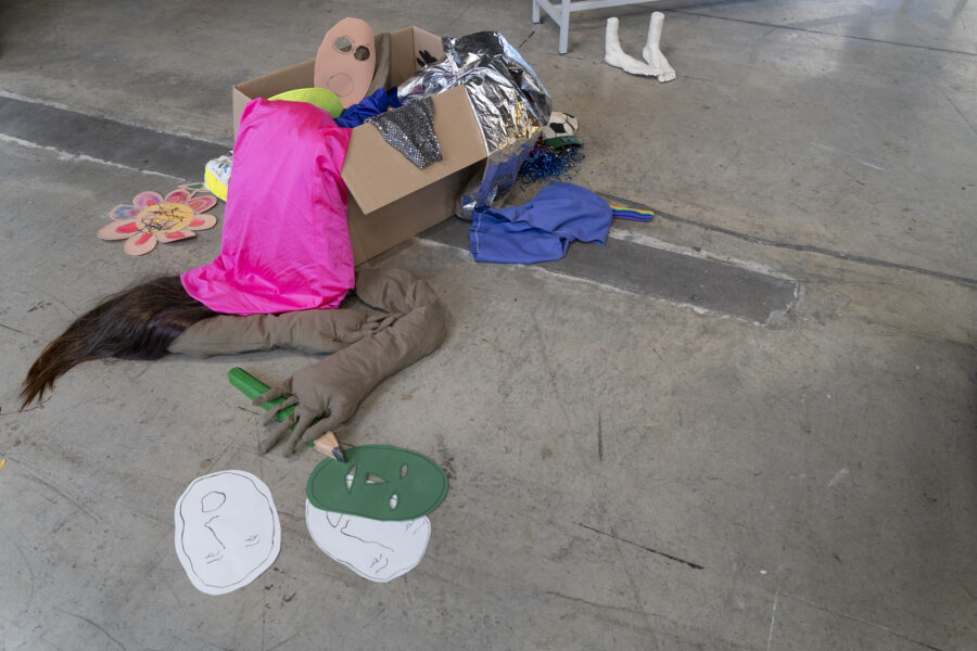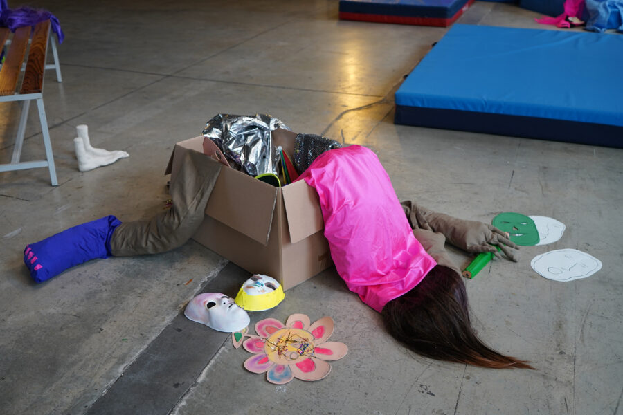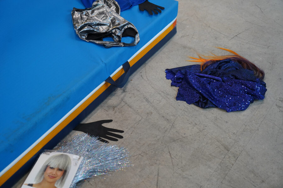 Le travail de Louise Porte s’intéresse au collectif, aux liens et à la capacité du médium de la performance à nous relier et à nous transformer. Lors de sa rencontre avec son groupe d’adolescent·es, l’artiste est arrivée avec sa mallette à outils, remplie de costumes, de perruques et de paillettes, de matériel sonore, dans l’intention de leur proposer des dispositifs permettant d’explorer d’autres manières d’être, de s’exprimer et de se découvrir à travers l’incarnation de personnages. Mais rien n’a pris à travers le groupe : la gène était trop forte. Sa classe était dans un refus à la fois conscient et inconscient. Le refus d’être associé à un projet lié aux ULIS est par association stigmatisant. Le refus de se détourner de la norme à travers des personnages inventés. Le refus de composer une histoire collective. Le refus d’être ensemble, parfois.