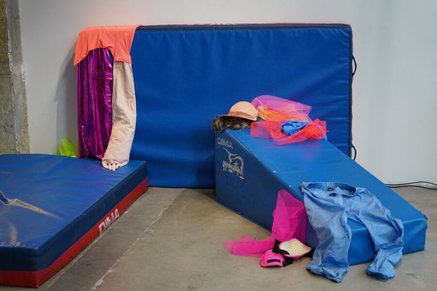 Installation sonore, banc de vestiaire, tapis de gym, céramique, carton, costumes divers, 9 min 30