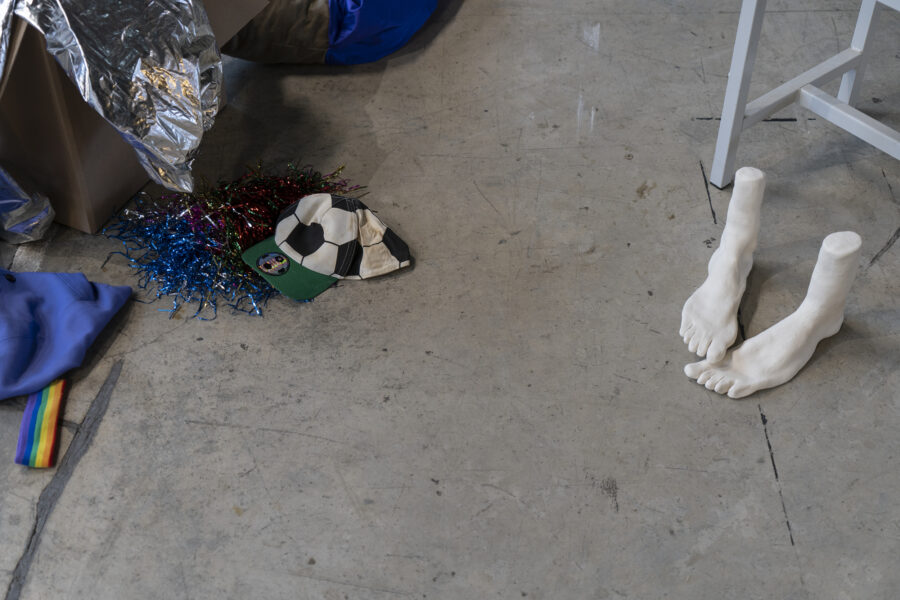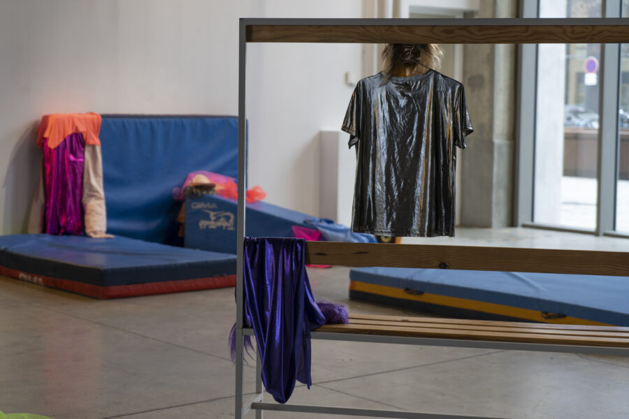 En attendant est donc une installation en attente. Elle re-met en scène l’atelier collectif qui s’est déroulé dans la salle de sport, dans une tentative échouée de faire tomber les barrières, les codes et les normes liés à la salle de classe. Accompagnée d’une bande sonore où se juxtaposent les voix des adolescent·es et de l’artiste et leurs ressentis respectifs, l’installation rend compte de la frustration partagée lorsqu’une rencontre n’advient pas.
