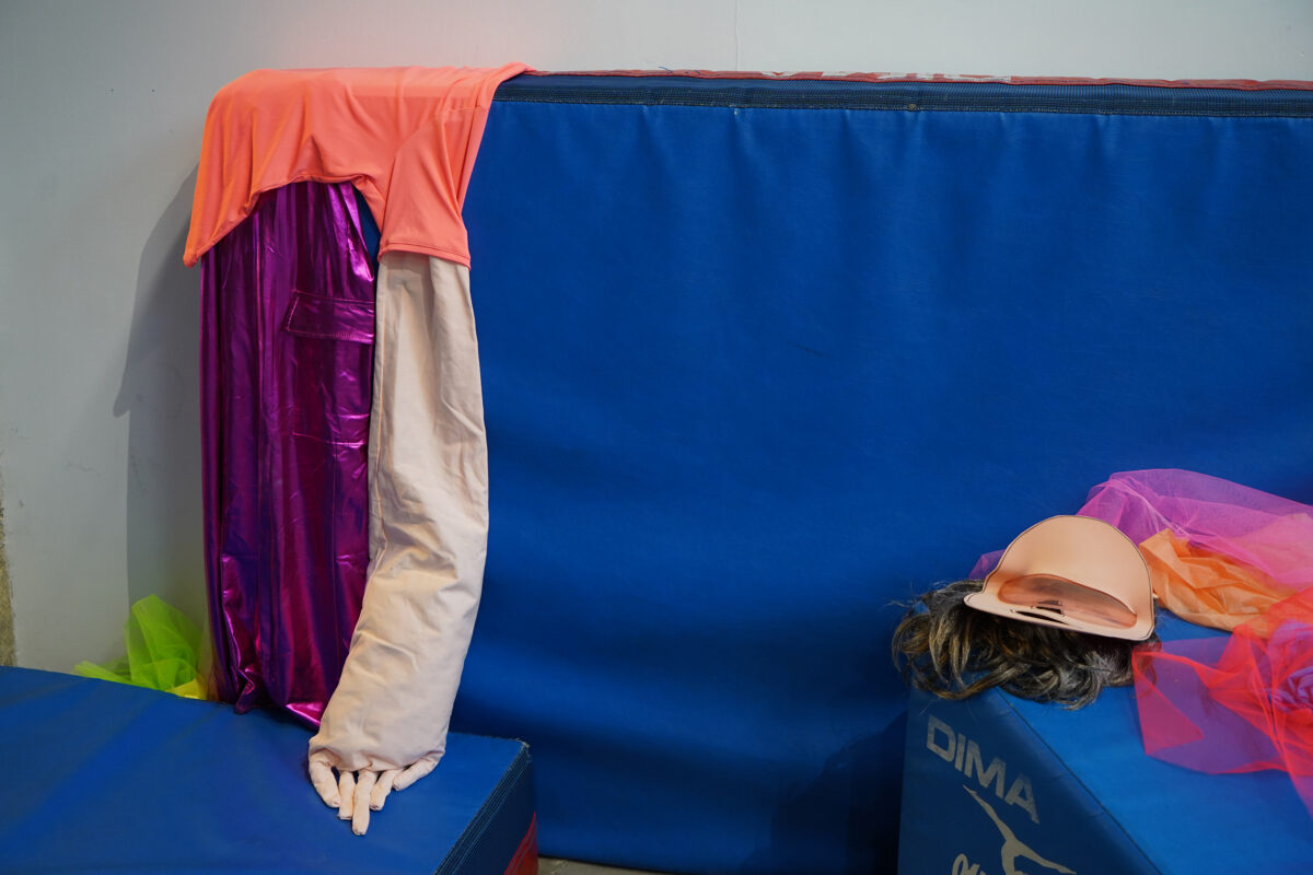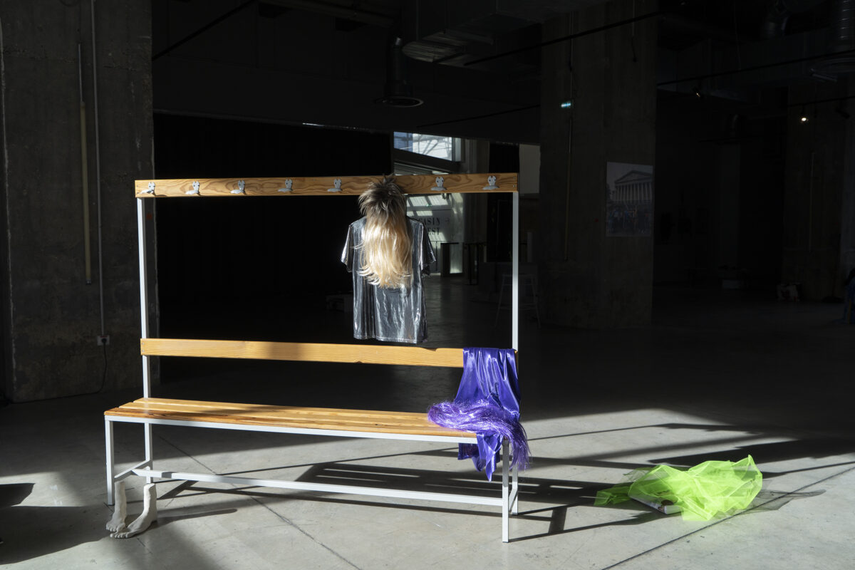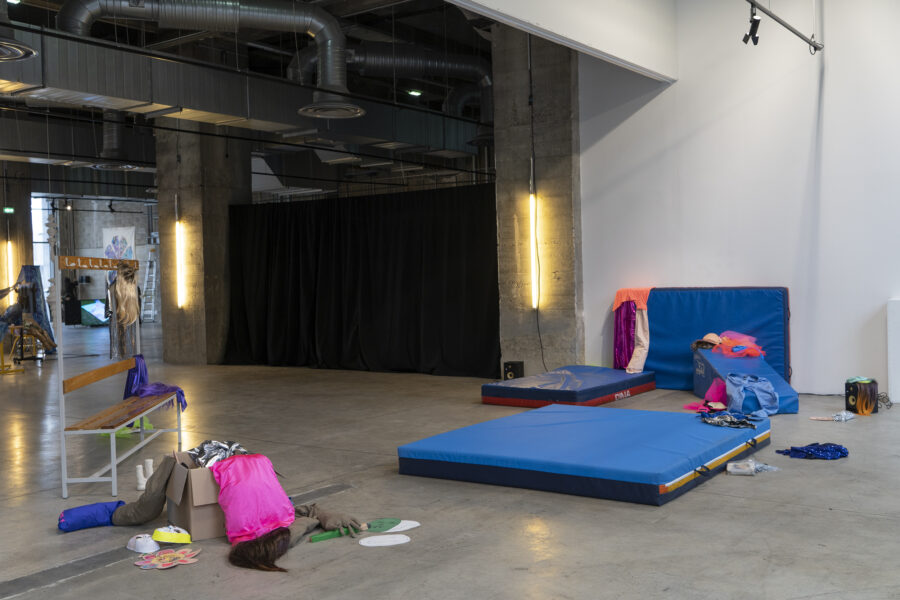 Installation sonore, banc de vestiaire, tapis de gym, céramique, carton, costumes divers, 9 min 30