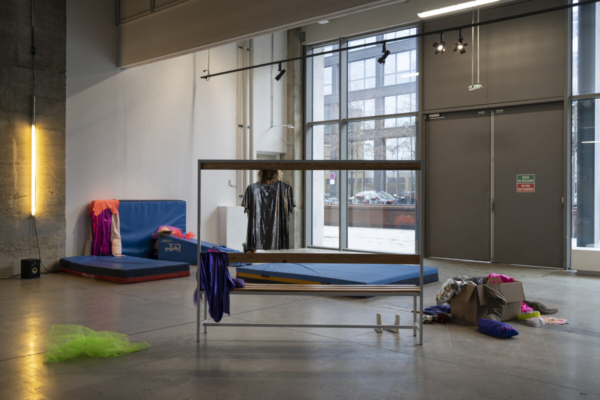 En attendant est donc une installation en attente. Elle re-met en scène l’atelier collectif qui s’est déroulé dans la salle de sport, dans une tentative échouée de faire tomber les barrières, les codes et les normes liés à la salle de classe. Accompagnée d’une bande sonore où se juxtaposent les voix des adolescent·es et de l’artiste et leurs ressentis respectifs, l’installation rend compte de la frustration partagée lorsqu’une rencontre n’advient pas.