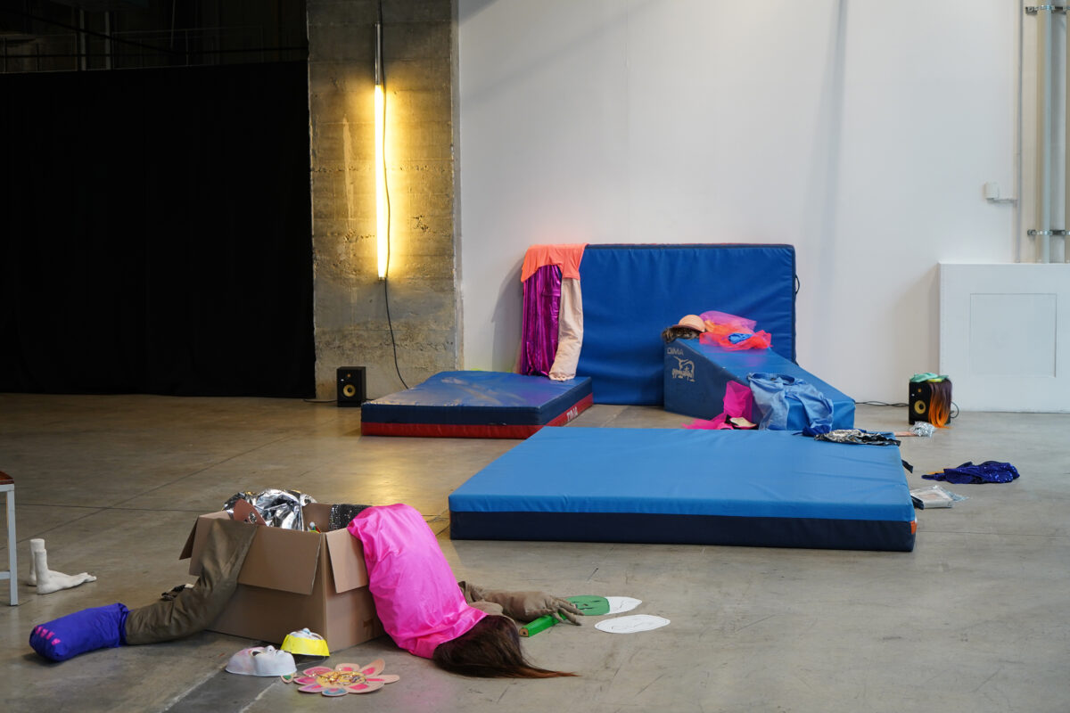 Le travail de Louise Porte s’intéresse au collectif, aux liens et à la capacité du médium de la performance à nous relier et à nous transformer. Lors de sa rencontre avec son groupe d’adolescent·es, l’artiste est arrivée avec sa mallette à outils, remplie de costumes, de perruques et de paillettes, de matériel sonore, dans l’intention de leur proposer des dispositifs permettant d’explorer d’autres manières d’être, de s’exprimer et de se découvrir à travers l’incarnation de personnages. Mais rien n’a pris à travers le groupe : la gène était trop forte. Sa classe était dans un refus à la fois conscient et inconscient. Le refus d’être associé à un projet lié aux ULIS est par association stigmatisant. Le refus de se détourner de la norme à travers des personnages inventés. Le refus de composer une histoire collective. Le refus d’être ensemble, parfois.