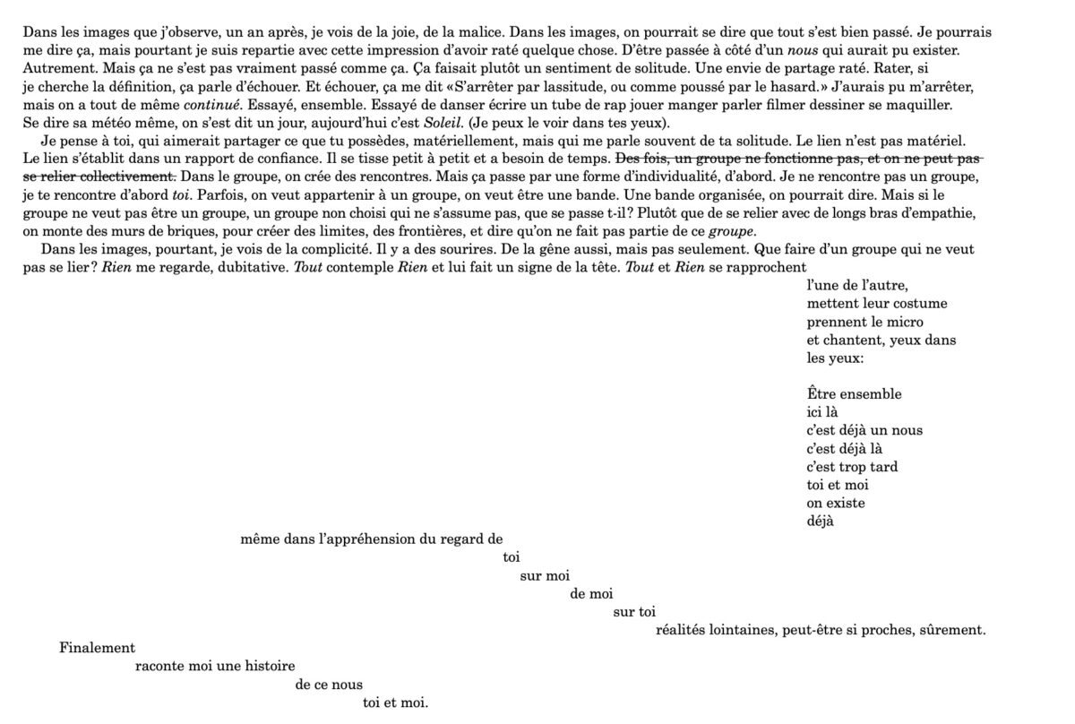en collaboration avec : Sorin Ciurar, Enzo Djeroum, Yasmine El Boucherour, Mayasse Hatri, Ibrahima Karamoko, Merveille Kambaja, Léandro Montel, Samï Mtimet, Noah Ngenge, Joan Pit, Steven Voisin, les adolescent·es du dispositif ULIS – Unité localisée pour l’inclusion scolaire du Collège Pierre Mendès France (Paris)