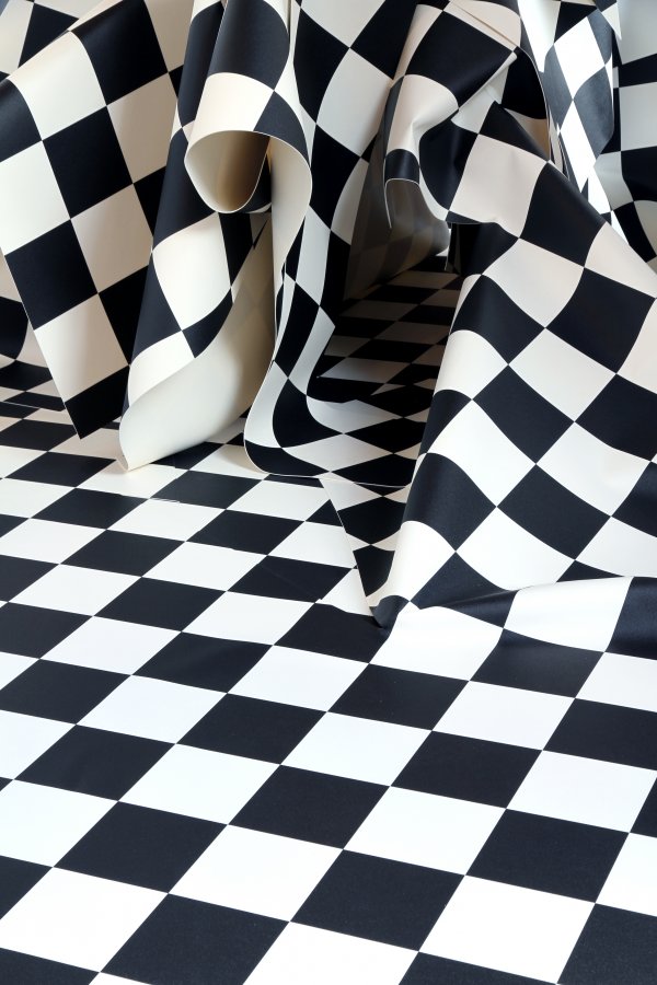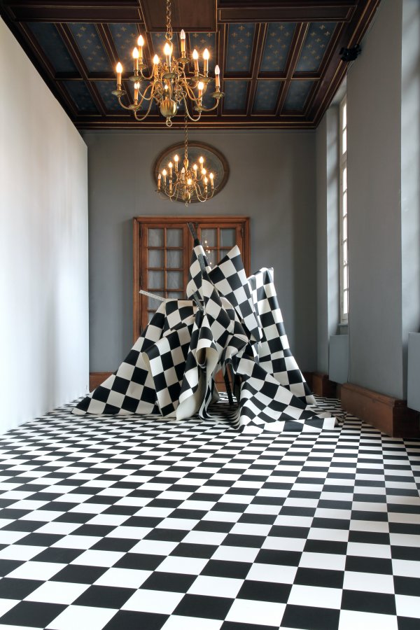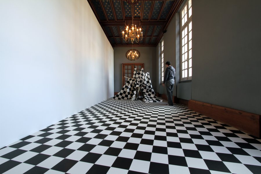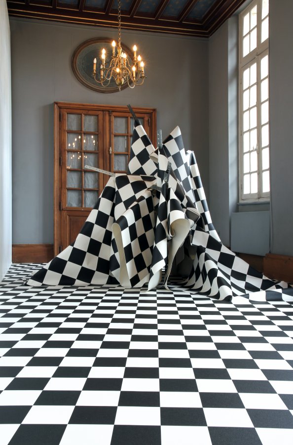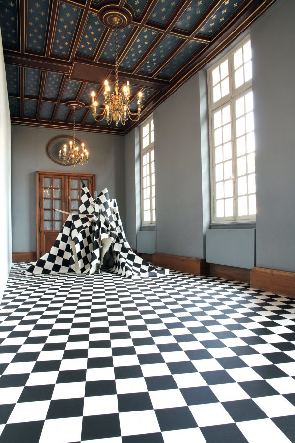 Les œuvres de l’artiste français Vincent Mauger prennent la forme d’installations in situ, d’objets-sculptures, de travaux graphiques ou de projections vidéo. Il emploie souvent des matériaux « pauvres » ou de construction (briques, parpaings, aggloméré, papier) à partir desquels il crée des paysages alvéolaires vallonnés. Ses installations entraînent le spectateur dans un univers virtuel déshumanisé qui rappelle la facture des logiciels de modélisation 3D. Leur trame, rythmée et répétitive, invite à poursuivre mentalement les pièces, à en imaginer les prolongements au-delà de l’espace d’exposition, vers un infini lointain. Leur ancrage dans le sol et le plafond ainsi que leur circonscription dans le lieu ne sont peut-être qu’un leurre, qu’une hypothèse : la partie visible de l’iceberg. Inspiré par le motif et le décor en général, l’artiste produit pour cette exposition un projet spécifique directement inspiré par les lieux et par le chapiteau du cirque. Vincent Mauger présente aussi une animation inspirée du carrelage du Petit Vestibule. L’imagerie virtuelle et les légers tremblements de I’ animation attirent le spectateur dans un univers proche des jeux vidéo. Posée au sol, la pièce semble refléter les motifs décoratifs du carrelage et renvoie par son caractère illusionniste aux dispositifs et » trucages » magiques propres aux scénographies du cirque