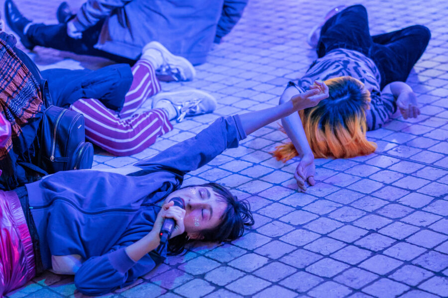 Encore une fois nous emmène dans l’univers d’une fête où différents personnages se retrouvent pour danser, expulser, lâcher, se lâcher. La performance est construite comme un dialogue dans lequel se mêlent désirs et injonctions, absurdité et sensualité, attente et impatience. Les personnages abordent la fête tant comme exutoire que comme moyen de se lier les un.es aux autres. Au rythme des lectures et des danses, des basses lointaines et des tubes des années 2000, la performance questionne notre rapport à la fête tout en invitant les spectateur.ice.s à prendre part aux festivités.