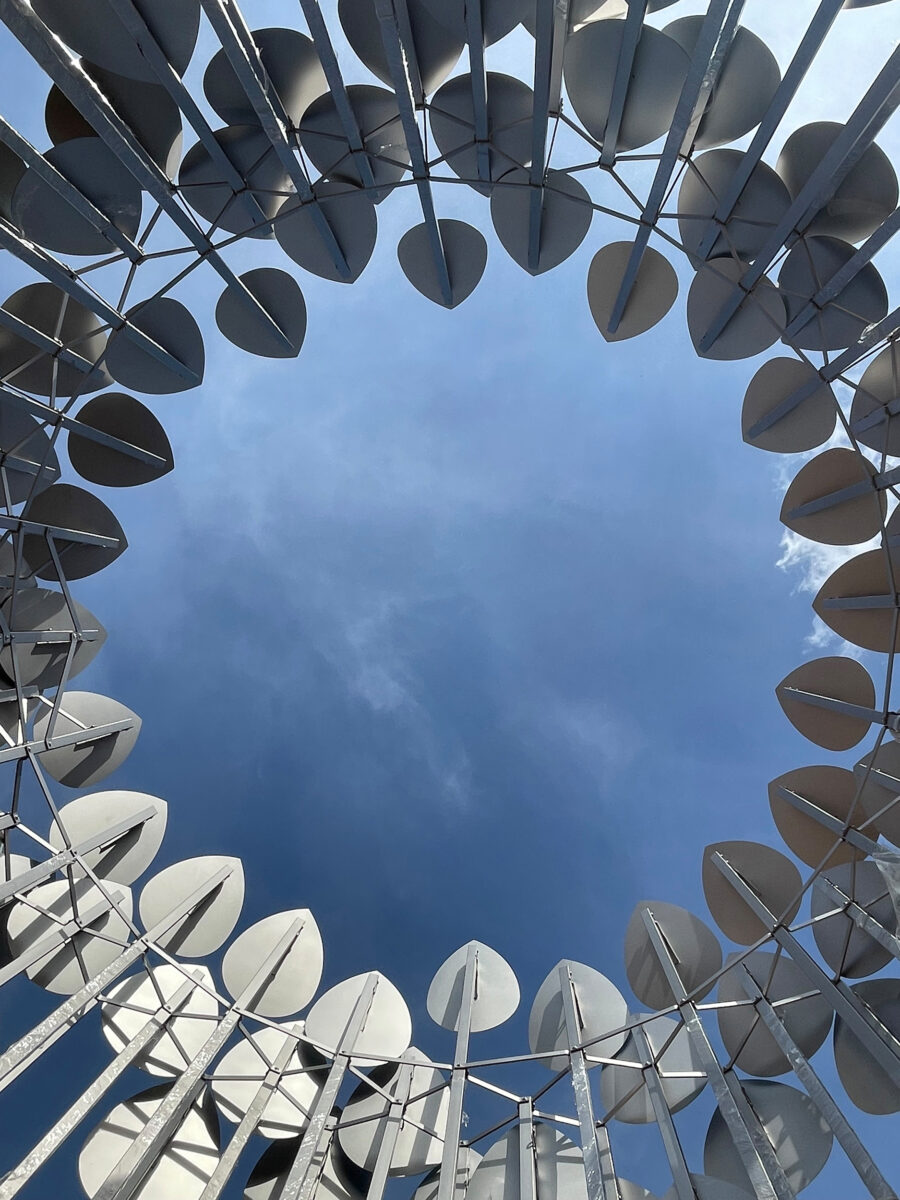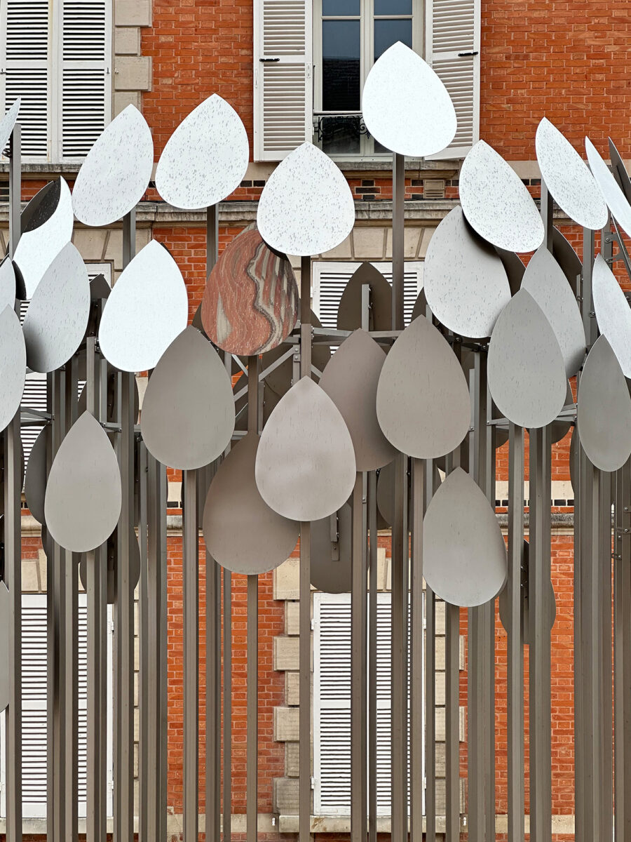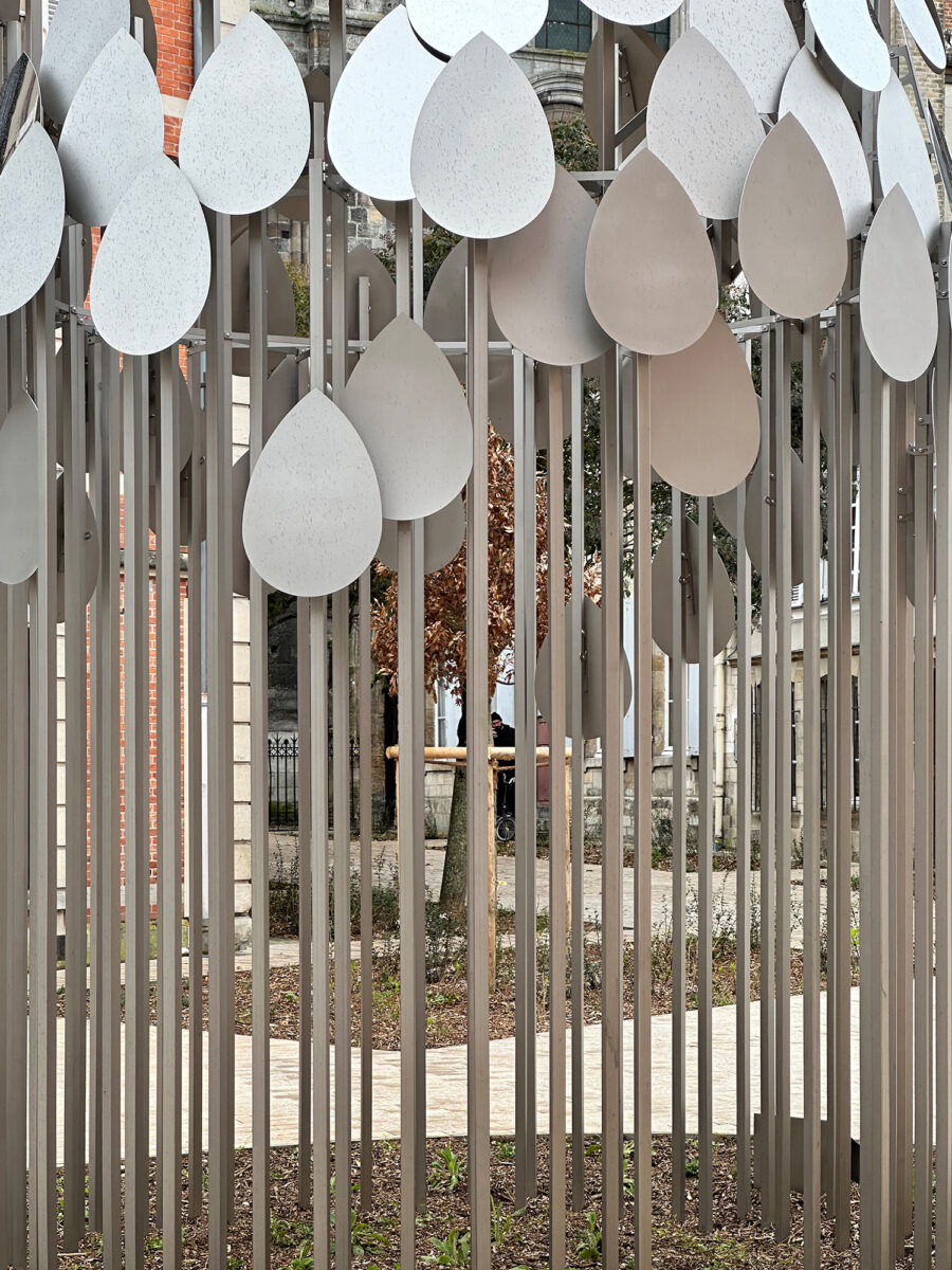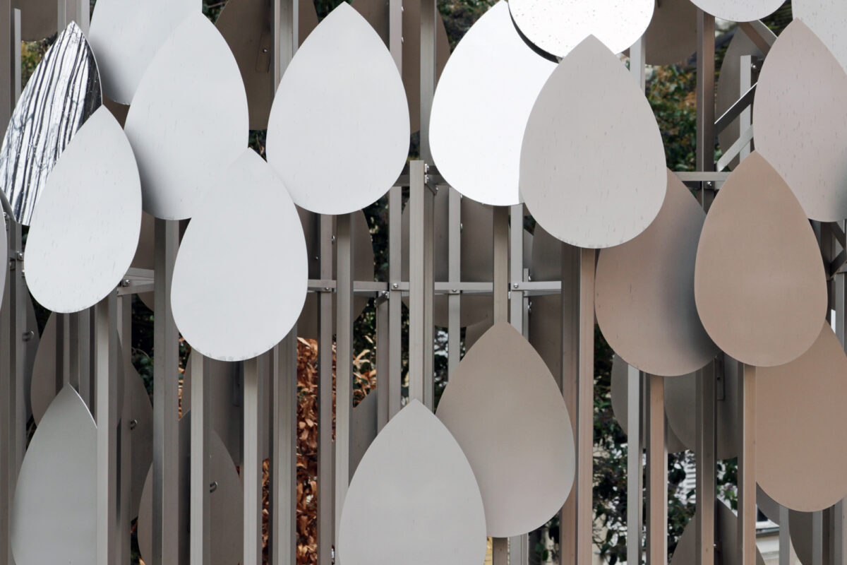 Composée de multiples plaques métalliques en forme de gouttelettes, elle forme un ensemble pouvant également évoqué la goutte d’eau tel un fractal, ou le jaillissement, l’écoulement.