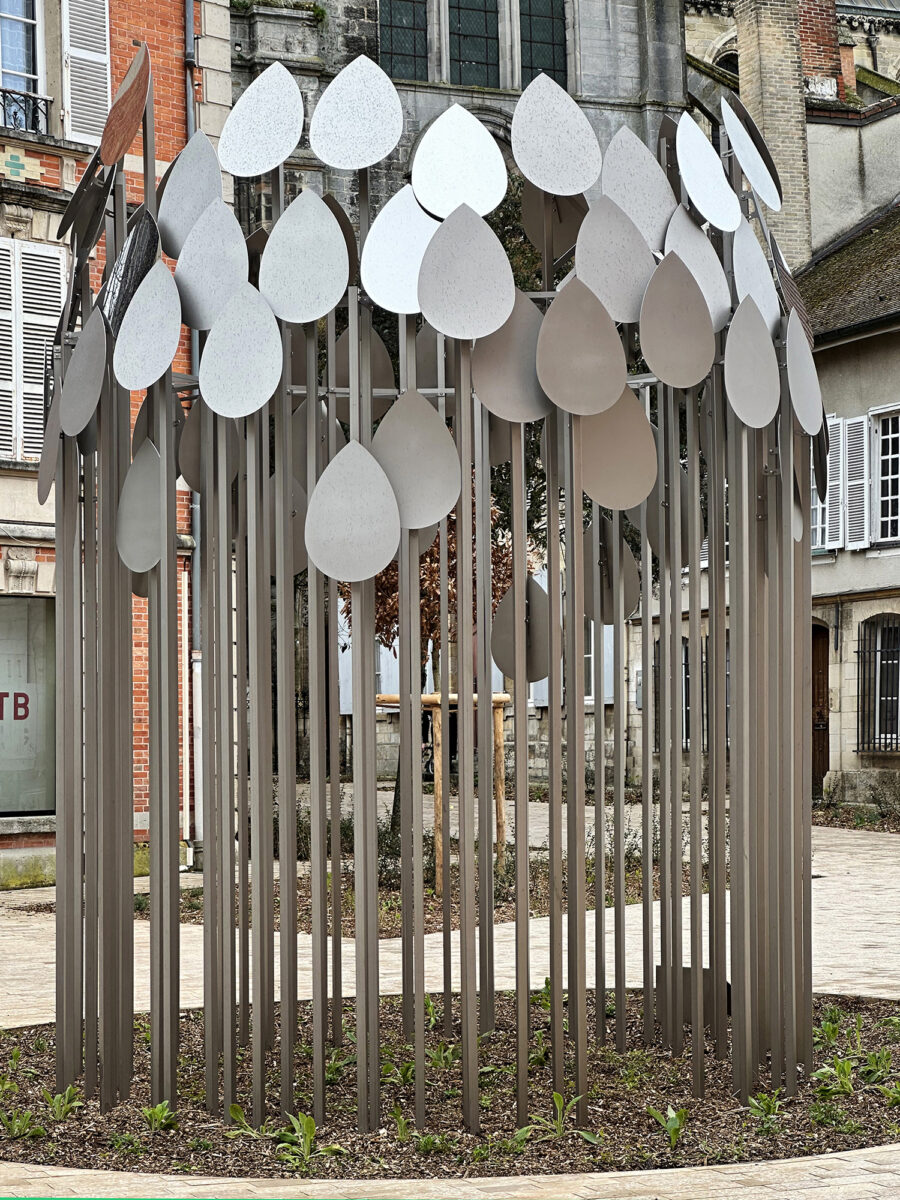 Le volume prend la forme des gouttes ou d’un instantané, ou d’un graphique représentant des gouttelettes se dispersant dans l’espace. Les plaques composant le volume sont découpées suivant la forme d’une goutte stylisée. La forme globale évoque un jaillissement, de l’eau qui ruisselle. Cette proposition tisse donc le lien entre la placette et le parcours paysager des 3 fontaines. Les matériaux employés ainsi que le mode de construction confère au volume un aspect insaisissable et changeant qui le rapproche ainsi par la perception l’eau. Elle évoque aussi son aspect festif et spectaculaire mis en valeur par la programmation culturelle et touristique de Châlons-en-Champagne valorisant la présence de l’eau au sein de la ville.