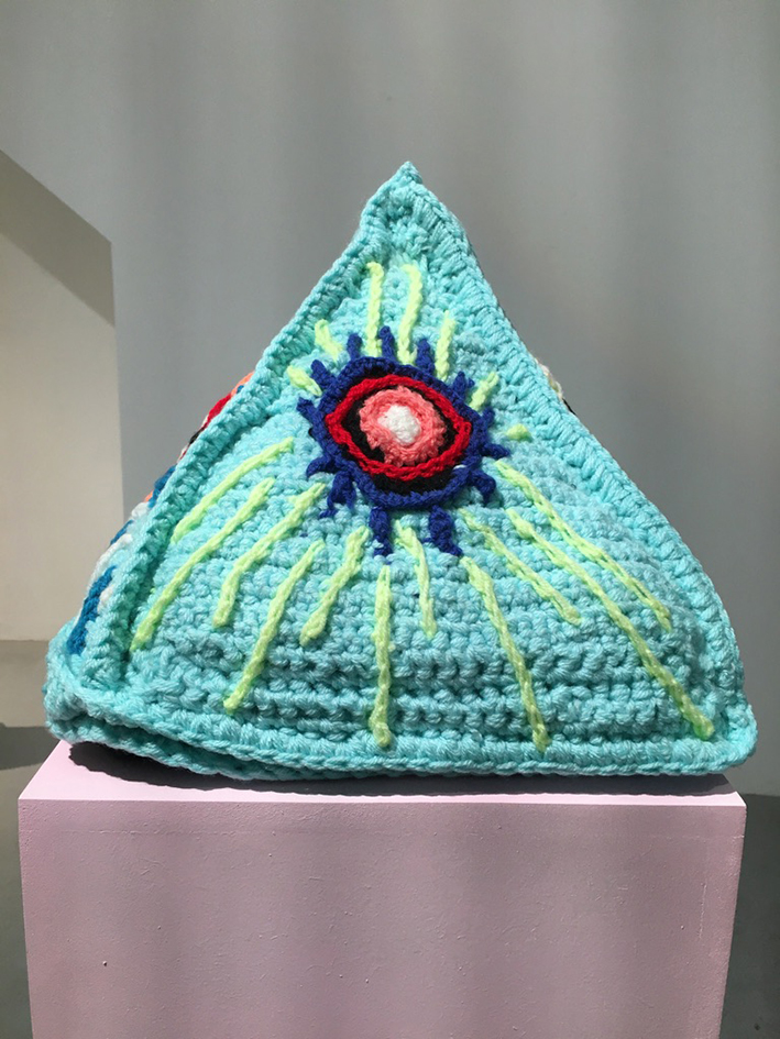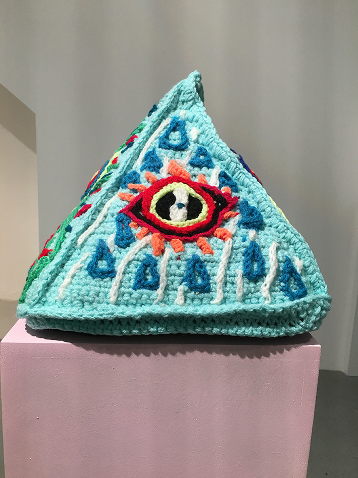 Le regard est tout aussi important dans « Espaces d’espèces », l’exposition de Laurence Broydé à l’Atelier Alain Lebras2. Les yeux y sont omniprésents ; ils sont multiples, inhérents aux Sculptures à porter réalisées au crochet. Ainsi, nous rencontrons Visio, Rainbow, Argos, Le Troisième Œil, Fireman, (toutes de 2017) dans un environnement qui ressemble à une scène de théâtre ; nous nous retrouvons vraisemblablement dans leur habitat naturel, elles nous font miroir et nous renvoient à notre propre présence—d’observateurs en observation. Nous nous retrouvons parmi ces sculptures- totems, perchées sur leurs piédestaux, attendant qu’un événement encore inconnu se déroule…