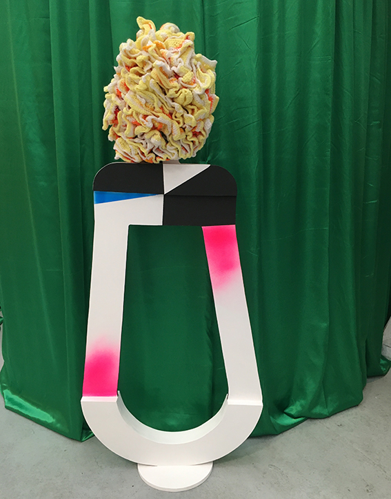 Un changement de perspective, un repositionnement est souvent présent dans ces œuvres. Dans Oratoire (2022), nous pénétrons dans un espace circulaire et matriciel pour nous rapprocher d’une sculpture en état de non-usage—ou Lagerform4, pour emprunter un terme à l’artiste allemand Franz Erhardt Walther. Scala Vestibuli (2018), est une Sculpture à porter dont le socle, bas-relief en céramique, est couronné d’une volumineuse masse médusesque au crochet cramoisi et noir, portée pour la dernière fois lors d’une performance5 en 2021. Un autre de ces déplacements a lieu avec les petites fleurs crochetées et les boules de chewing-gum et des ballons en verre soufflé. Lorsque nous nous rapprochons de ces sculptures, nous découvrons que ce qui était autrefois de nature fragile et transitoire a été imprégné d’une aura beaucoup plus résistante ; tel un masque que l’on enfilerait pour devenir quelqu’un d’autre. Un pas un arrière et nous nous rendons compte que ce qui semblait être au départ un petit jardin tranquille est devenu un visage qui nous regarde, taquin.