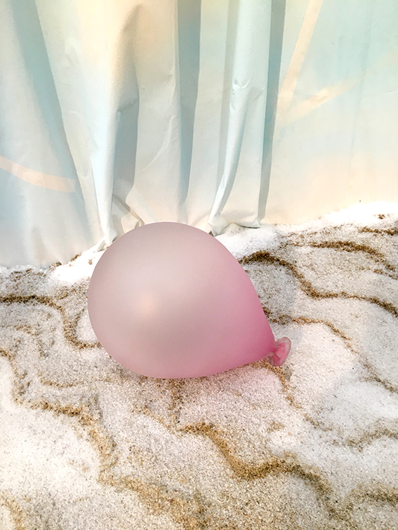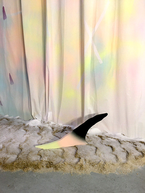 Il y a de la transcendance, également, dans la peinture immersive (de la série Open Space) qui sert de toile de fond au groupe. Ici l’artiste prolonge l’espace d’exposition, faisant allusion à d’autres existences (l’hétérotopie de Foucault), d’autres forces, d’autres états d’esprit. Lors d’itérations précédentes des Open Spaces, elle a créé des extensions virtuelles à l’aide de peinture à l’Aérographe et de scotch, transformant des espaces transitoires—tel que des escaliers ou des couloirs—en histoires ouvertes dont le contenu sera déterminé par le public. Ces œuvres nous rappellent que les espaces liminaux comptent aussi. Ils sont ici le lieu et le décor d‘interactions transitoires ; un échange de regards, une conversation, un nu duchampien descendant, voire même une vidéo de hip-hop, comme cela a été le cas au 38 Breil à Nantes. Dans les travaux de Laurence Broydé, des éléments contrastés se réunissent ; tantôt en harmonie, tantôt en contrepoint. Ceux-ci se révèlent parfois capricieux—une langue qui émerge du centre d’une fleur—parfois réflexifs—une sorte d’écran-rideau remplaçant la mer. Une palette de couleur vibrante d’énergie se juxtapose à des thèmes issus de l’antiquité—des masques rituels, l’ici et l’au- delà, la présence d’esprits et d’êtres de l’outre monde et qui font référence à d’anciennes croyances animistes, à d’autres conceptions de l’univers. L’incertitude est aussi présente dans des traces de notre société de consommation laissées sur le sol sableux— emballages en plastiques, gobelets jetables et chewing-gum mâchés hantent l’avenir de notre planète avec pour seule garantie la promesse d’un réchauffement climatique.