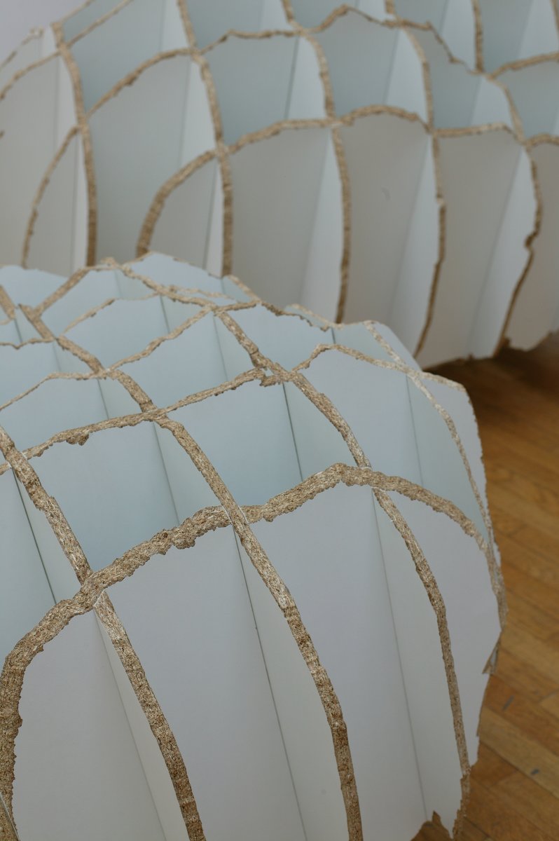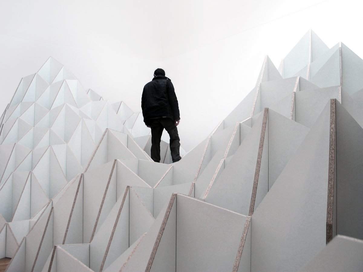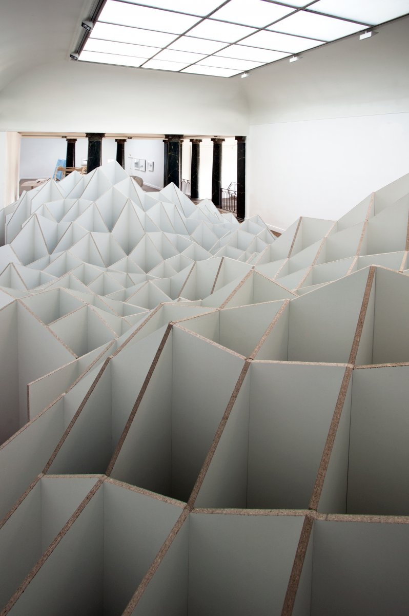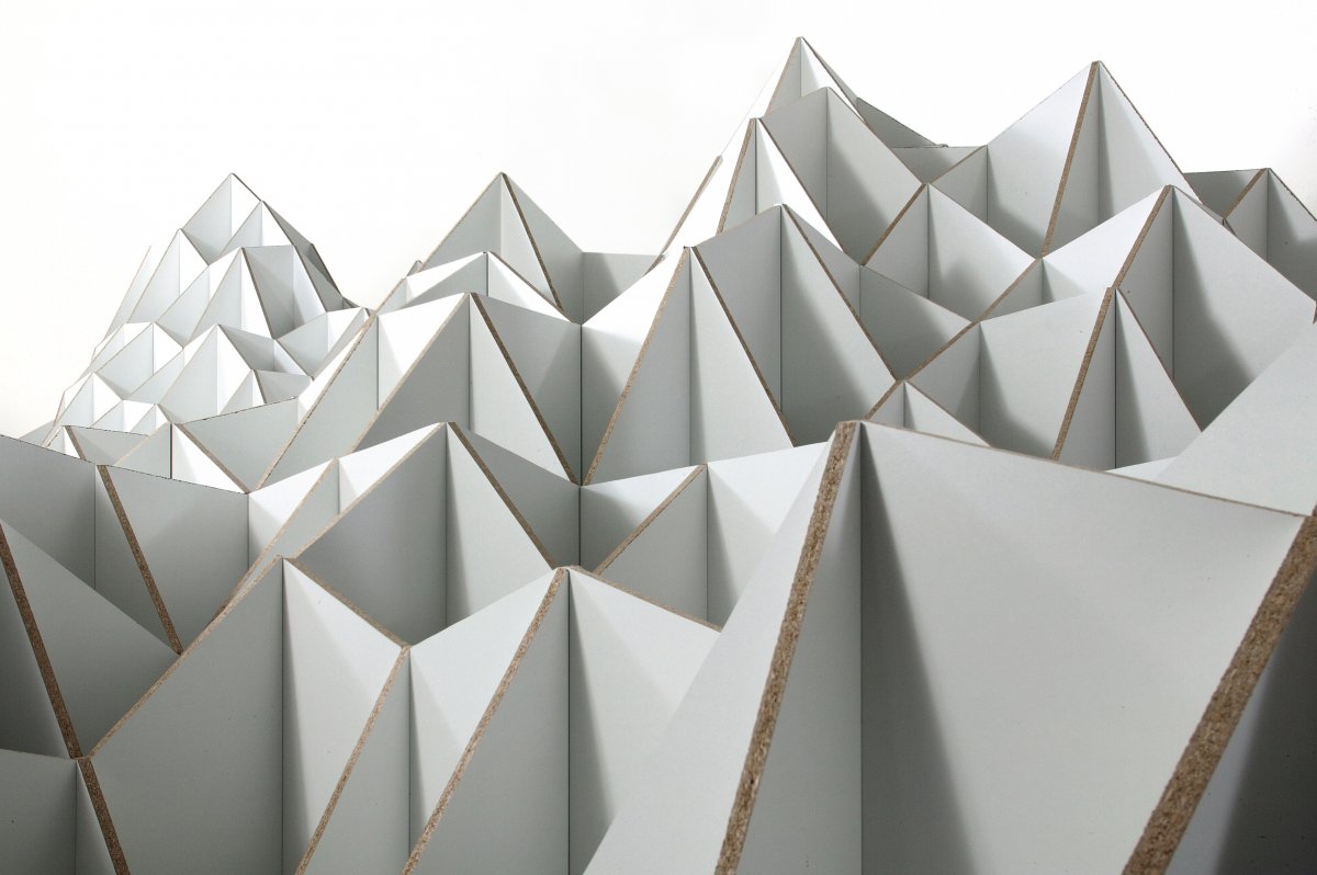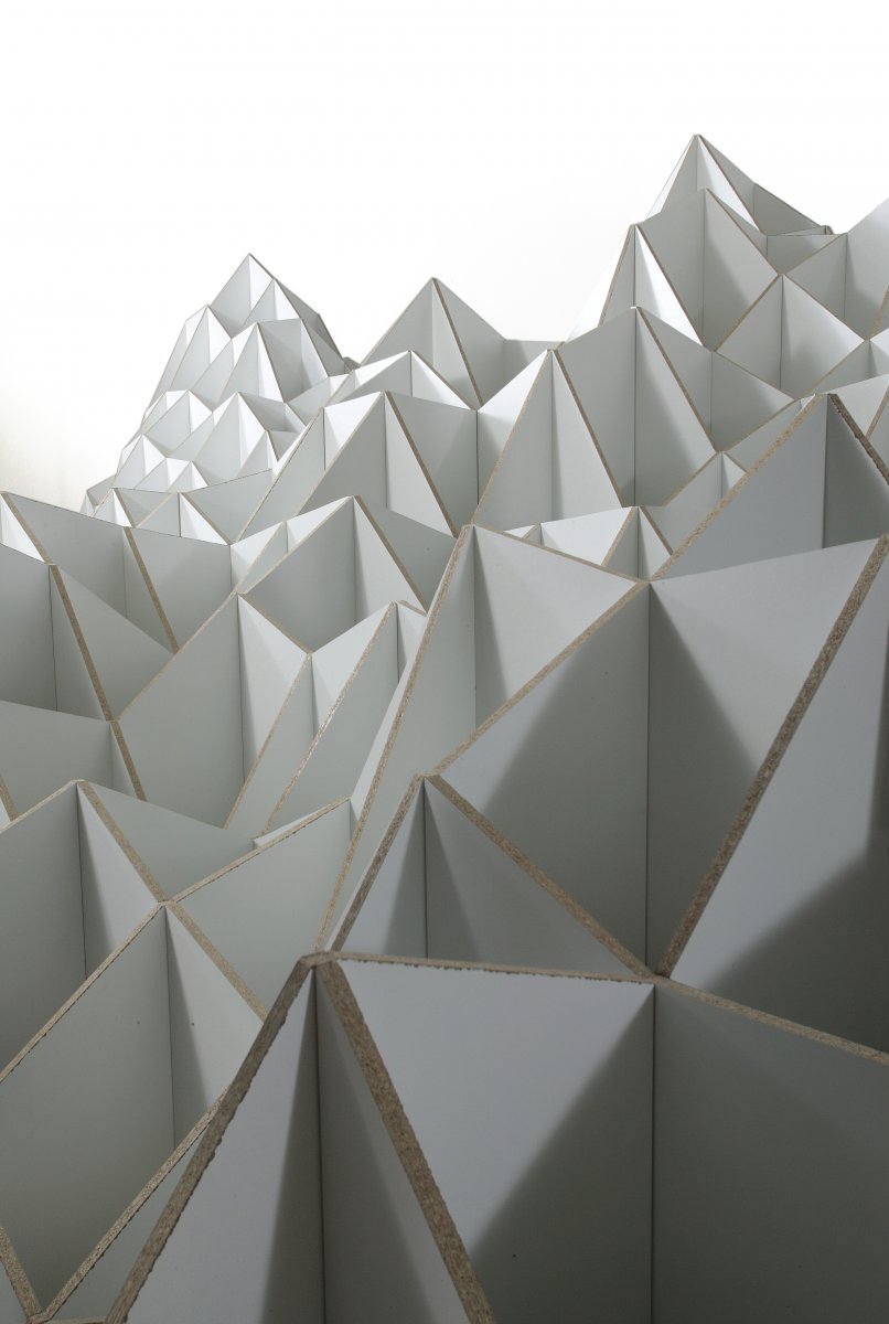 VM- Plus simplement, la couleur blanche est une évidence. Je n’aurais pas choisi du mélaminé coloré. Mais il y avait, bien sûr, cette idée d’une feuille blanche sur laquelle les arêtes viennent se dessiner. Les arêtes sont beaucoup plus présentes sur un fond blanc que sur un fond coloré. Et puis, le mélaminé, c’est un peu du carton… Donc, oui : il y a cette idée d’un dessin dans l’espace.