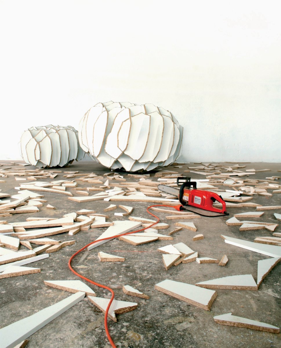 Pour en revenir à cet archaïsme de la méthode, encore une fois, il s’agit pour moi, dans l’idée de construire quelque chose, de déployer l’énergie nécessaire à toute production. Je n’ai pas envie que le spectateur soit amené à apprécier l’énergie qui a été dépensée pour un projet, mais plutôt à considérer ma volonté de m’affranchir de cette limite potentielle et d’instaurer un rapport irrationnel de sa gestion. Pour moi, plus l’énergie aura été déployée à son maximum, plus la pièce aura de la force. Ce rapport entre l’énergie déployée et la force de l’œuvre doit opérer sur le spectateur, il ne s’agit pas de mon propre rapport au travail, mais de ce que dégage l’œuvre et de ce qu’elle véhicule sur un plan sensoriel et mental. Dans le cas de cette pièce, le lieu est immense et l’œuvre semble se mesurer à cette dimension, vouloir la concurrencer. Et puis il y a l’enjeu, la prise de risque, l’ampleur des moyens engagés.