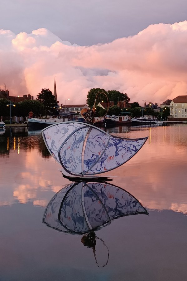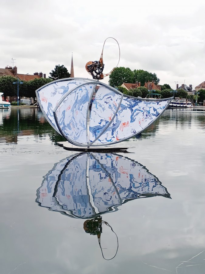 acier, toile de spi, grès émaillé, osier Canal Satellite Migennes sur une invitation de CanalSatellite Art Contemporain Exposition Tandem(s)
