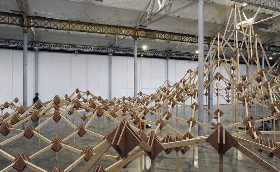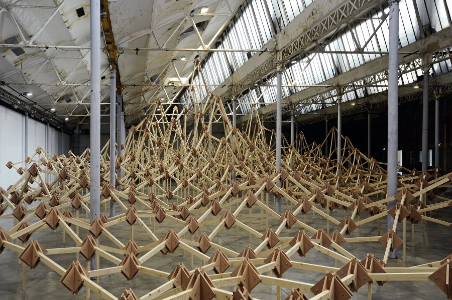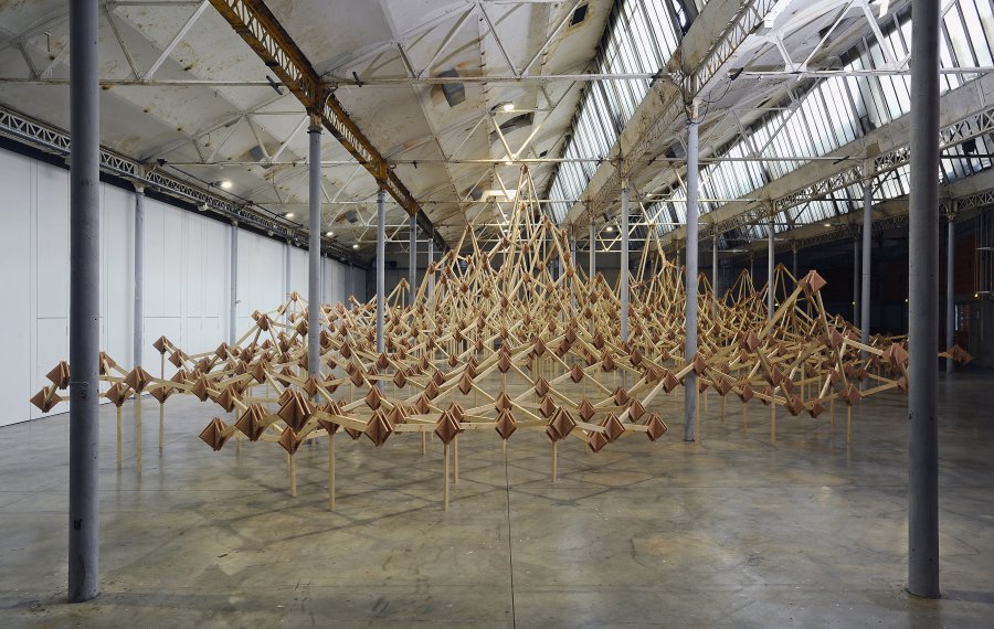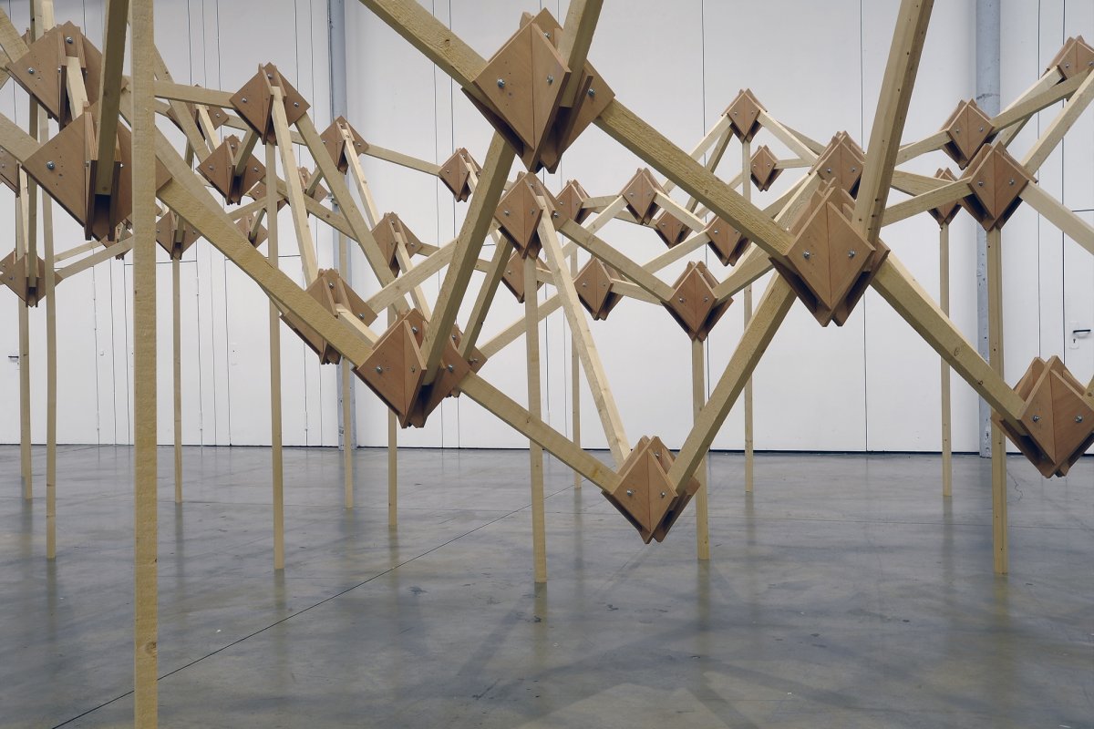 L’un des enjeux de ce travail se situerait précisément entre matérialisation et dématérialisation de l’objet. Vincent Mauger propose des va-et-vient constants entre construction volumineuse (plaisir d’exploration du matériau, défi du chantier parfois monumental) et légèreté virtuelle. Dans les effusions numériques de l’ère contemporaine, il réintroduit du jeu, couplant une dimension plus primitive, un imaginaire plus artisanal à la sophistication des logiciels 3D. L’installation Sons titre zoo7, présentée en zoo8 à la galerie LH, confirme ce pouvoir d’hybridation : des lignes souples sculptent la surface alvéolaire de tubes de PVC assemblés verticalement, et cet ensemble convoque instantanément son double modélisé, sa représentation virtuelle. Le système de construction (basé sur la multiplication, le foisonnement) permet de poursuivre mentalement la pièce, d’en imaginer les prolongements bien au-delà du lieu d’exposition, dans une dynamique de l’expansion et de I’ envahissement. Dans un esprit proche, l’artiste présente en zoo8 au Frac des Pays de la Loire une sculpture dont la surface happe le regard par ses couleurs électriques. Ondulante, elle pose légèrement ses incurvations au sol, comme flottant. Dans cette construction empirique, réalisée sans schéma ni modélisation antérieurs, Vincent Mauger expérimente le plaisir d’un principe de composition simple. Le module fondamental (la gaine PVC traditionnellement employée en plomberie) est utilisé ici comme une sorte de brique, un Lego. Cet assemblage basique, complètement artisanal, flirte cependant avec I’ idée que « l’ensemble ait l’air numérique », rejoignant alors la qualité d’une surface virtuelle hybride, un fragment de paysage, un agglomérat effervescent, un maillage textile, une colonie corallienne.