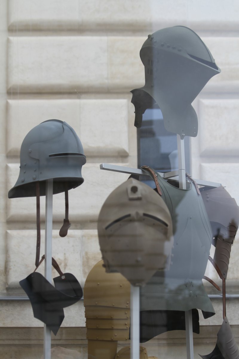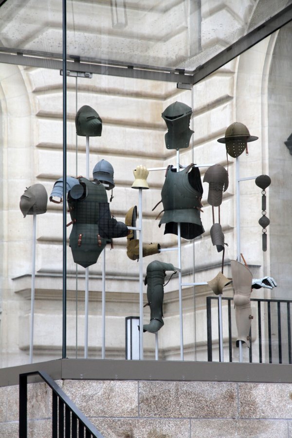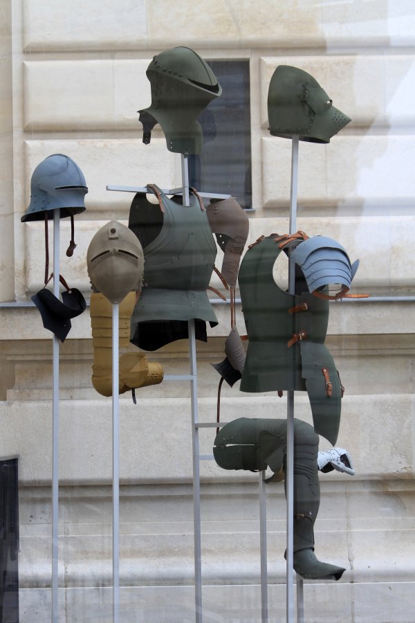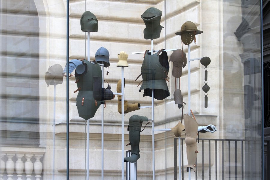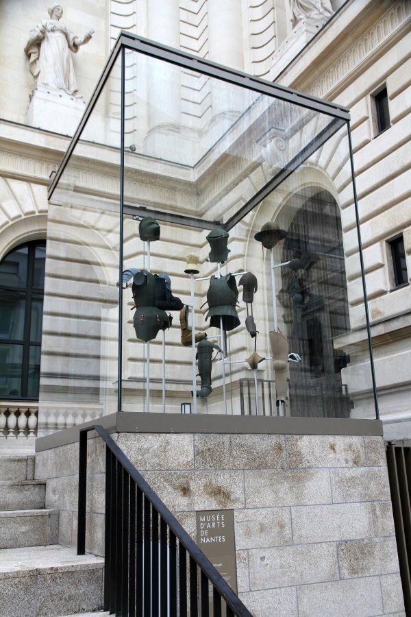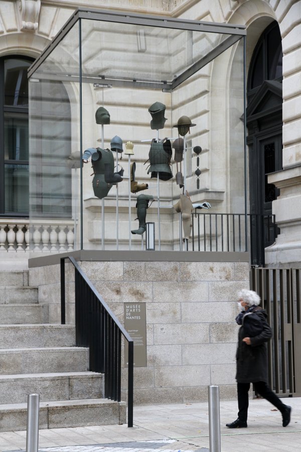 répliques d’éléments d’armures et de heaumes médiévaux repeints aux couleurs de véhicules blindés militaires, support en aluminium et acier. 3.5 × 3.5 × 3 m Musée des Beaux-Arts de Nantes sur une invitation de Sophie Levy et katell Jaffrès Parvis du Musée commissariat Sophie Levy