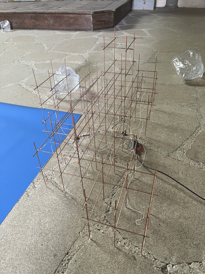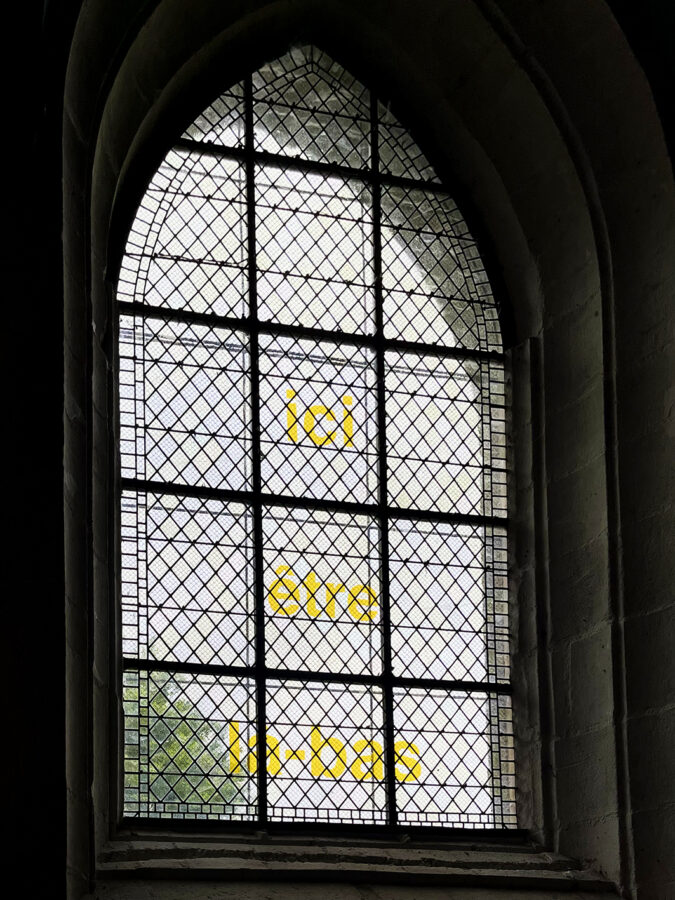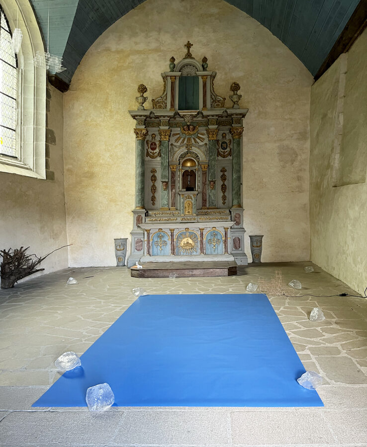 bcalet, «Être ICI/LÀ_BAS», 2024, Papier incrustation bleu, pierres de verre, structure en cuivre, souche avec cuivre, adhésifs jaunes, Chapelle des Rohan, Pontivy, photographie : ©bcalet