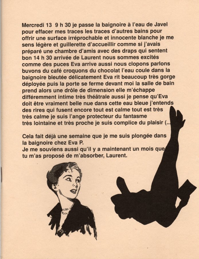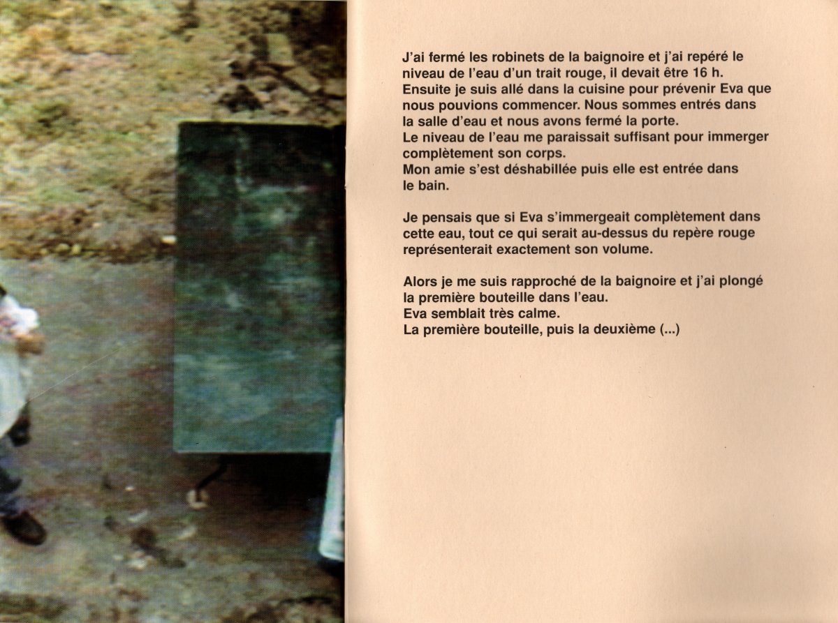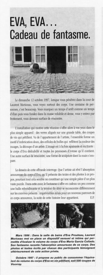La première étape de l’œuvre est une action au cours de laquelle l’artiste a mesuré le volume du corps de son amie (Éva) en l’immergeant dans une baignoire, chez une complice (Éva). Cette action très intime a été suivie d’une deuxième étape : une fête au cours de laquelle les invités de l’artiste ont bu l’équivalent du volume du corps d’Éva en vin pétillant (Vouvray).