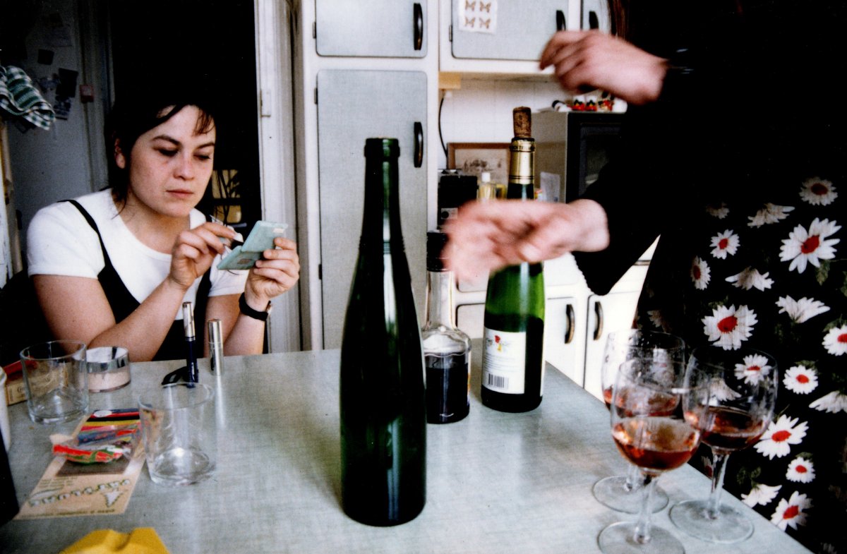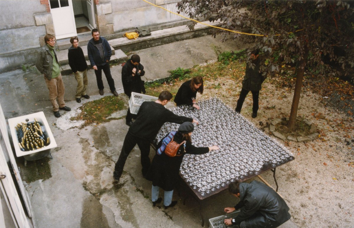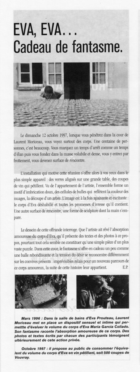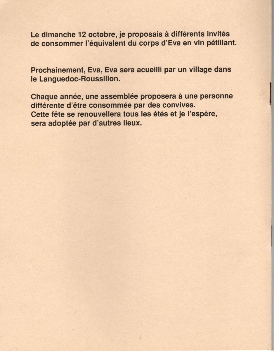 On s’informe discrètement du poids d’Eva : le nombre de litres à absorber. La multitude de verres vides puis pleins, puis vides, trace au fur et à mesure au centre de la table de nouveau territoires, une île en négatif dont le liquide constitue la surface. Autour le monde afflue et échange. Les amateurs (d’art) sont bientôt forcés de tendre le bras de la périphérie vers le centre, comme si les dernières gorgées (les extrémités d’Eva) se méritaient. La lie avant la suite. La rencontre initiale (Laurent et ses deux Eva) ne devient que le prétexte de notre réunion, elle participe d’un cycle. Nous ne faisons que répéter le prochain Eva, Eva qui réunira à l’échelle d’un village, plusieurs centaines de complices.