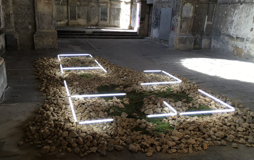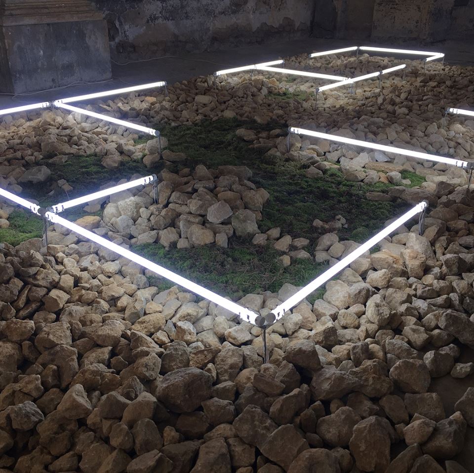 Soudain, …, 2019, pierre de Jaumont, mousse végétale, tubes fluorescents