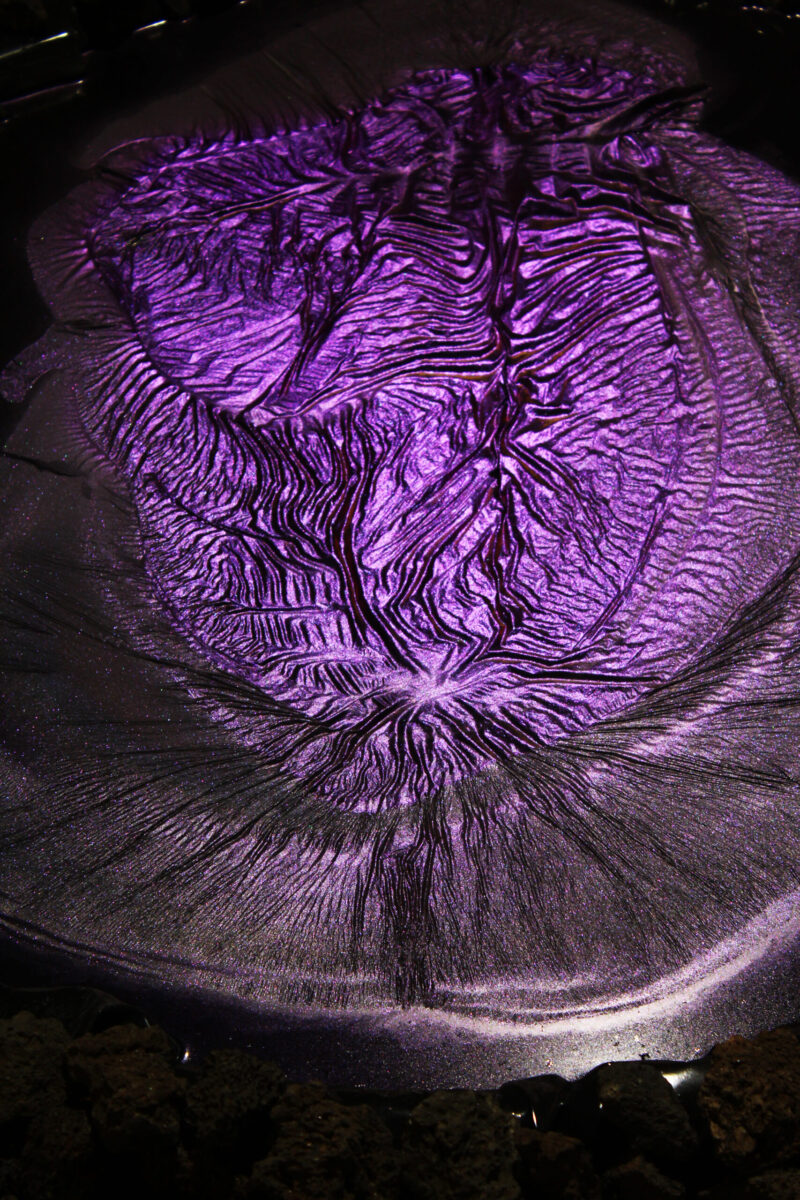 Au centre de Vichwa Galerie : Totale énergie, peinture mouvante aux pigments flottants, nous ramène à la surface de ces flaques irisées, dont la pollution ne cesse de nous rappeler (en vain) à la raison.