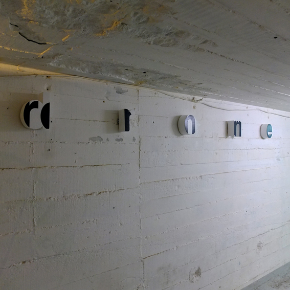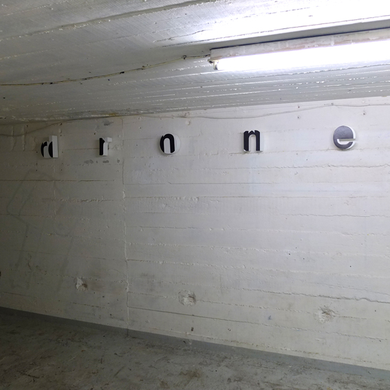 Drone (2016), lettres découpées, peinte en blanc [mot drone] et en graphite [mot ronde]