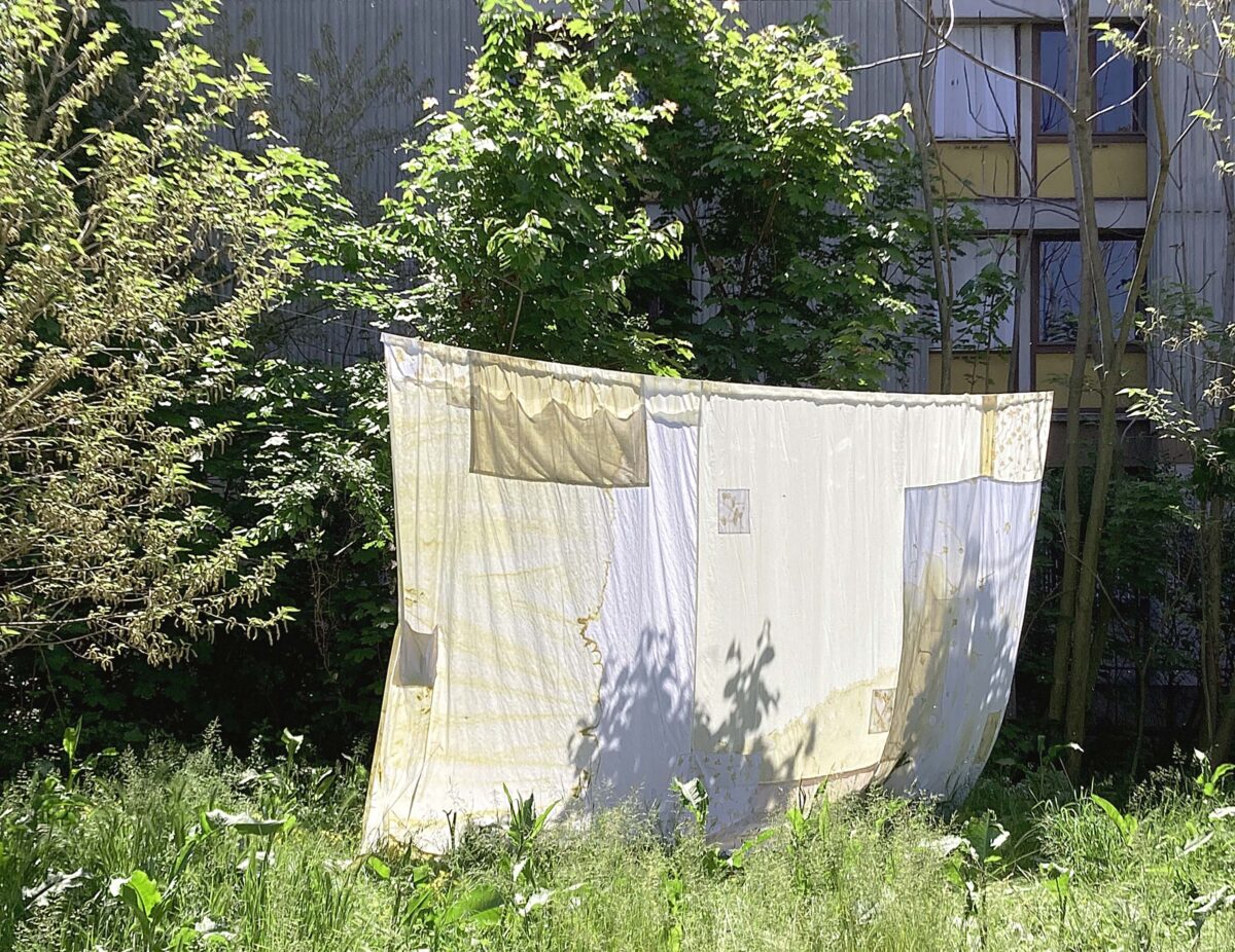 Patchwork de draps peints, teints et imprimés (tataki zomé) avec des végétaux (feuilles de mûrier, pissenlits, orties) et minéraux (briques) trouvés sur place Factatory Lyon, France Pièce réalisée dans le cadre d'une résidence de recherche avec le Collectif belle de nuit