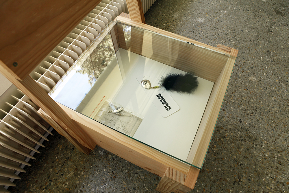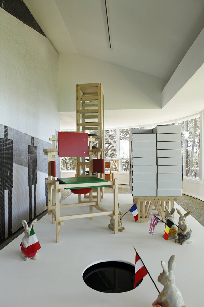 La première est la création d’oeuvres en relation avec le lieu, telles que Wooden tree, Fish Hotel, Flying Black Cow – l’origine, Unité d’habitation pour mariés de David Michael Clarke, Guillaume Janot, Fédérica Peyrolo, Christelle Familiari, Anabelle Hulaut et David Liaudet. La seconde consiste à réactiver des oeuvres de son répertoire telles que Flying Black Cow Club, DMC Light. La troisième est de demander le prêt d’oeuvres à d’autres artistes ou à des institutions en leurs expliquant la nature de l’exposition, telles que la cabane d’Anabelle Hulaut et de David Michael Clarke, Norbert Bézard, François Curlet, Francesco Finizio, Joël Hubaut, Nicolas Hérisson, Paul Pouvreau, Christophe Terlinden. Enfin la quatrième, David Michael Clarke se permet d’intervenir sur des oeuvres empruntées en ayant soin au préalable d’obtenir l’autorisation des artistes concernés telles que Niche (La ricarda) de Michel François, Carré Central d’Hervé Beurel, chaise d’Enzo Mari et les fauteuils de Gerrit Rietveld. Cette pratique, que l’on pourrait nommer collaborative, n’est pas sans interroger la question de l’auteur, le statut de l’artiste ainsi que la nature d’un tel projet.