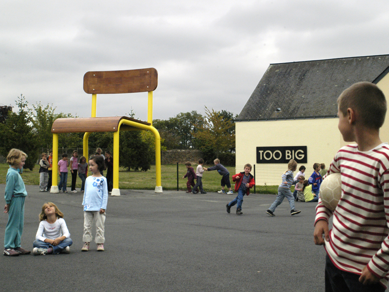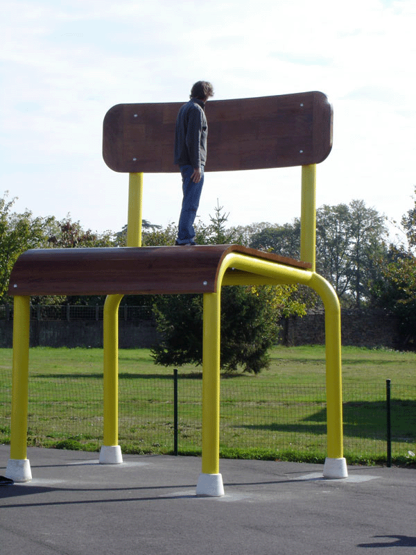 La deuxième pièce « Chair – Too Big », se trouve dans la cour de l’école primaire. C’est un agrandissement monumental d’une chaise écolière classique à l’échelle du bâtiment.