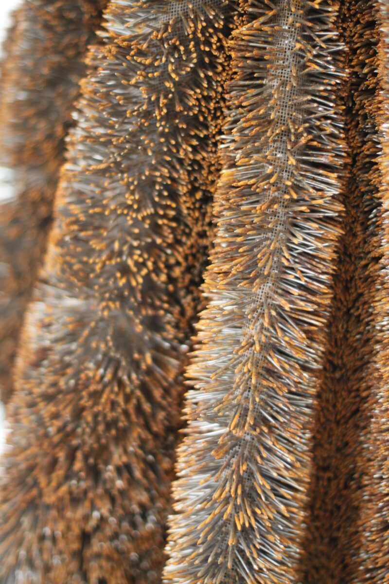 Clous en acier rouillés, maille fine, H: 70 cm vues de l’exposition "Locus Solus/HocusPocus", Musée Joseph Denais, Beaufort-en-Vallée, 2013 © Adagp, Paris, 2024