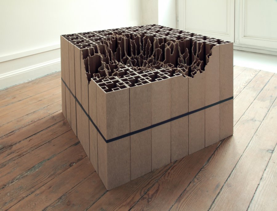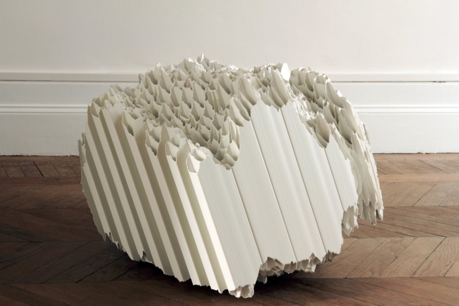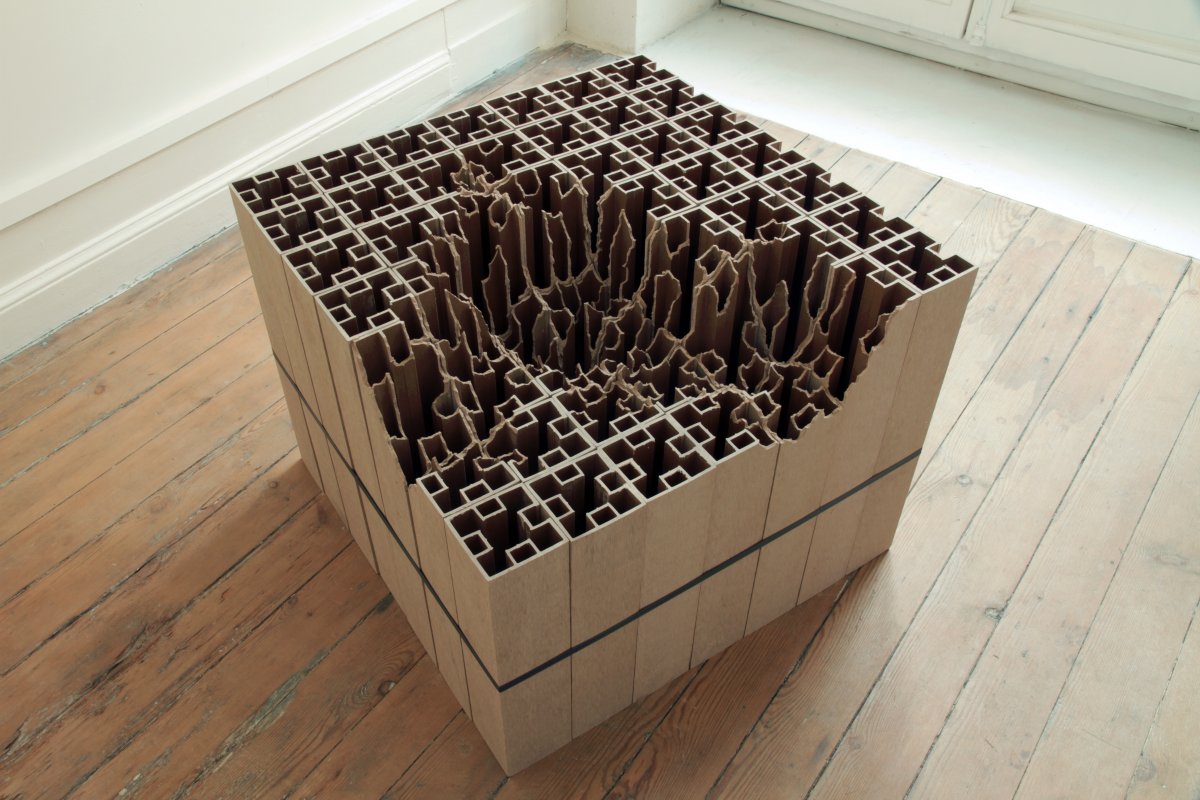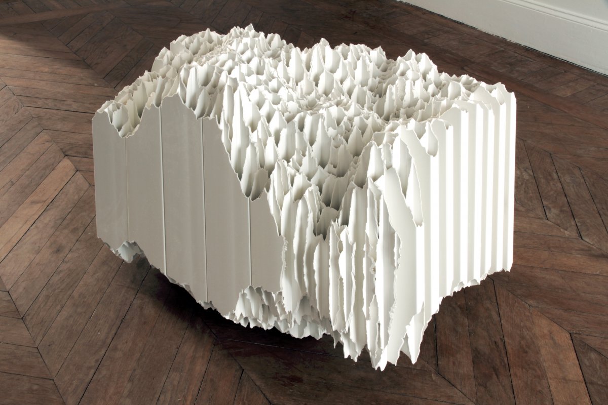 Brique, parpaing, tube pvc, bois, acier, polystyrène, plaque inox, Vincent Mauger s’approprie des matériaux de constructions ordinaires pour faire apparaître des formes inattendues, parfois complexes, toujours construites. Rochers, météorites, cartographies, sols, topographies…autant de sculptures qui entrent en interaction avec l’espace où elles sont présentées, quand l’artiste ne réalise pas une intervention spécifique pour un lieu donné.