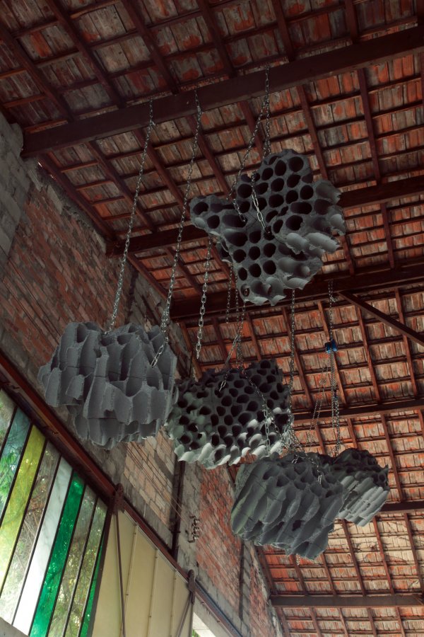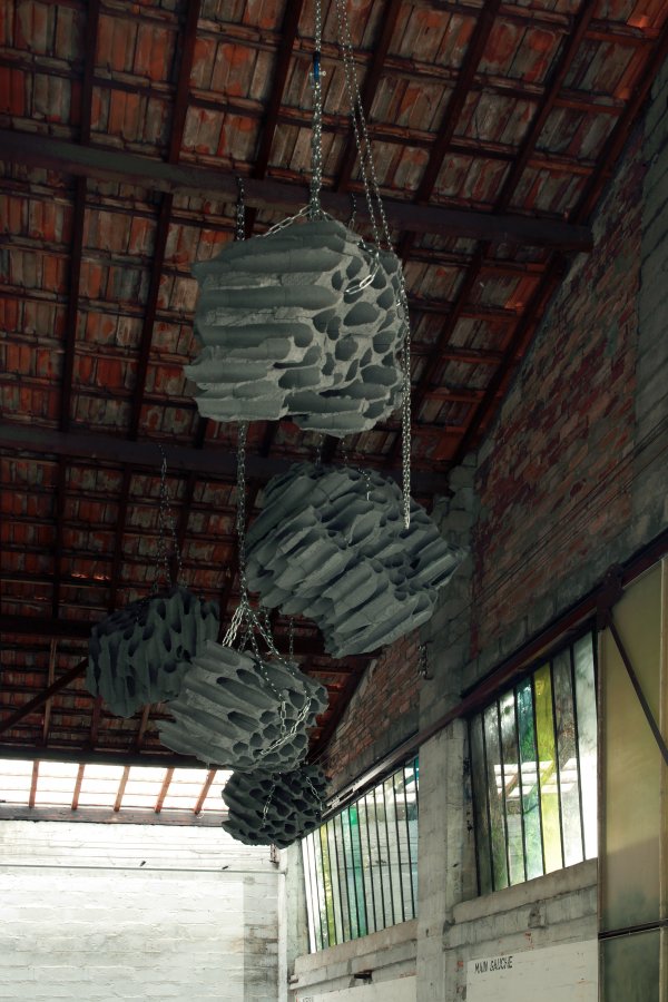Pour ses deux expositions à Bordeaux, Vincent Mauger investit l’agence d’architecture « Les Glacières » de Jean de GiacInto, Léo Rival et Matthieu Béchaux, ancien entrepôt de pains de glace, et propose par une installation inédite pour cet espace très marqué, une perte de repères du lieu en suspendant des blocs de polystyrène enchaînés les uns aux autres.