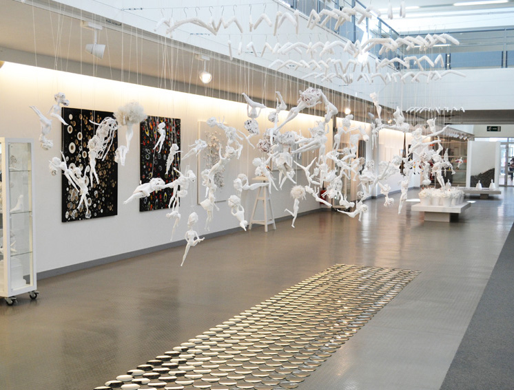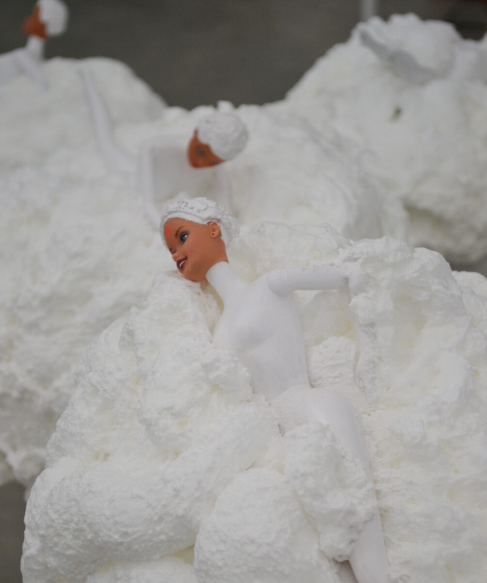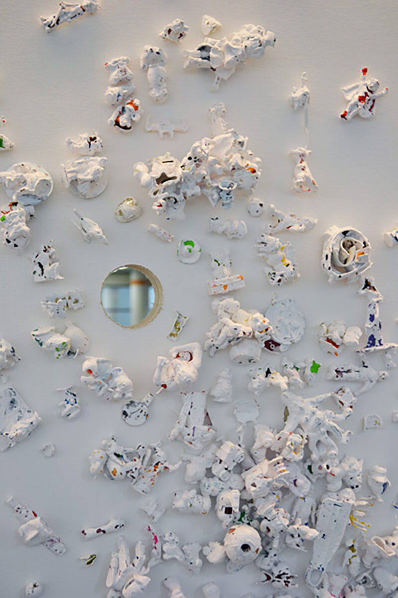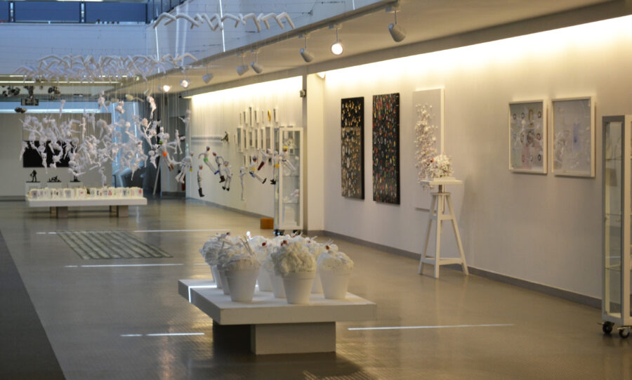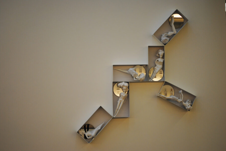 Nothing more different in appearance than the work of Frédéric Bonjean and Malika Larbi… Nothing more different and yet… More than one common point brings together this couple of atypical artists… The same concern to recover, to recycle without wasting. Everything is a treasure to them… Same instinct for play, same taste for lightness. Inconspicuously, without delivering messages, things are suggested softtly, brushed with a smile in playful accumulations : players, dolls, planes, who have fun not looking like toys… Same taste for movement: nothing is static in their proposals that match each other like a wink, tit for tat. Same passion for simple lines, purity, white, blank spaces open to the imagination…