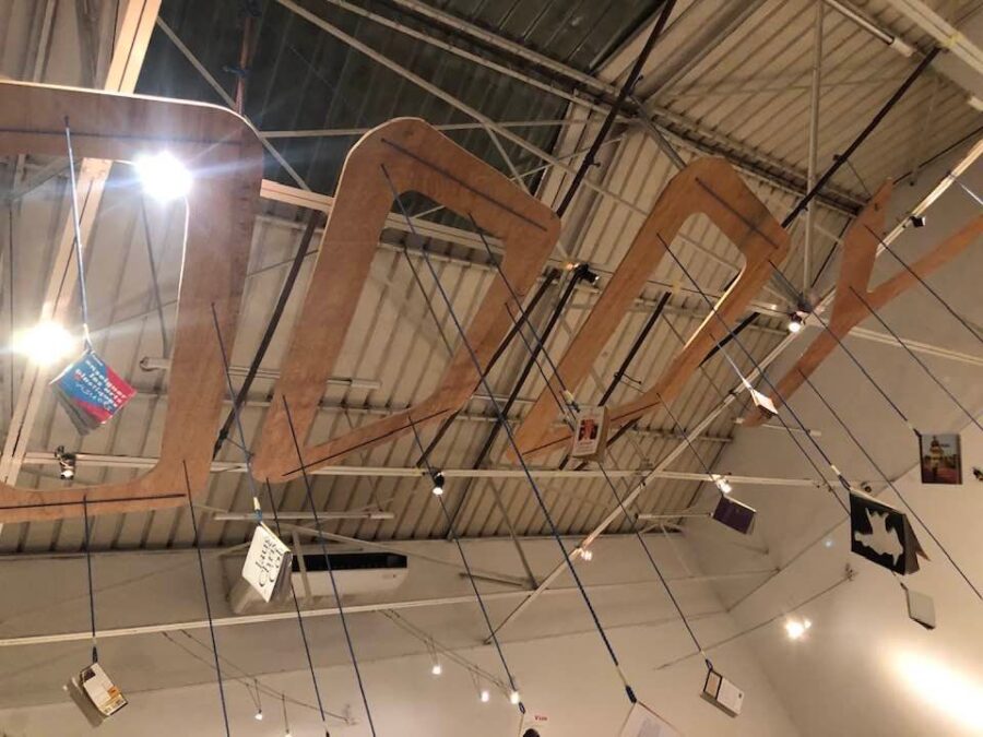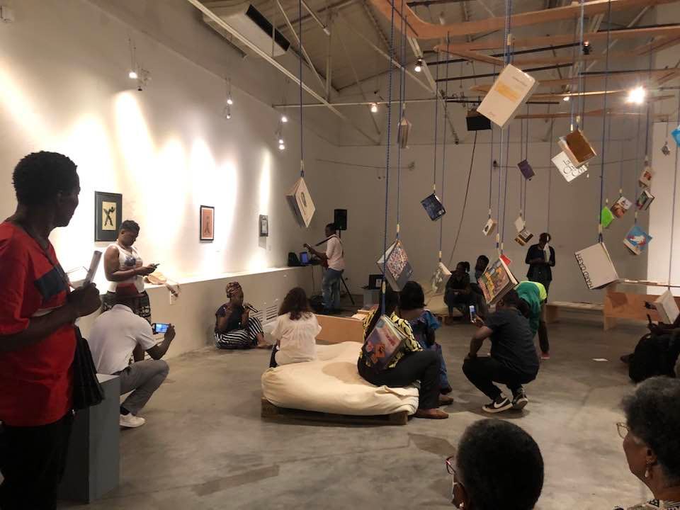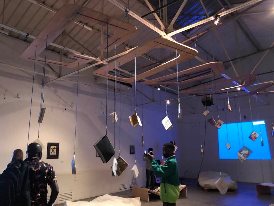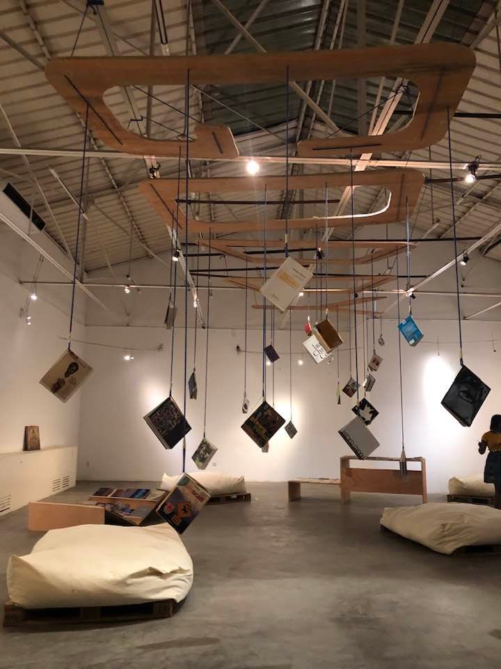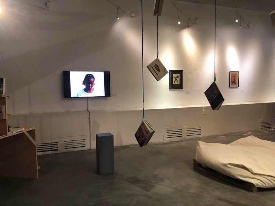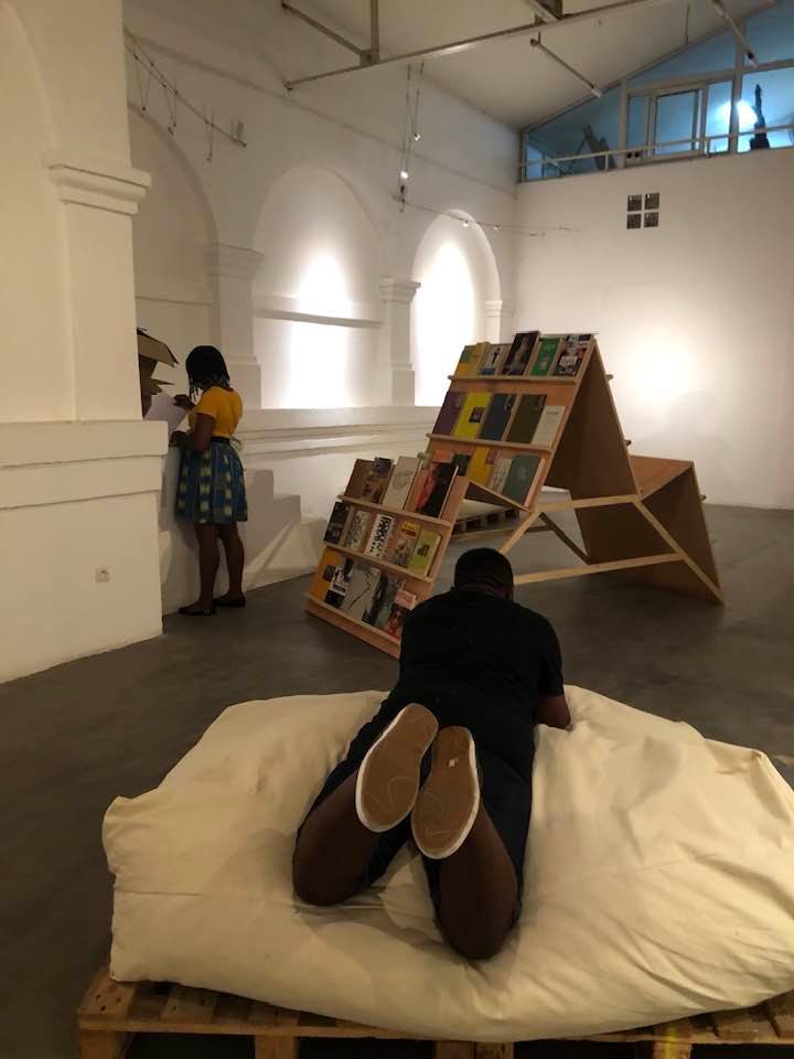 La bibliothèque éphémère conçue et désignée par Lucas Grandin donne un accès à des livres grâce au mobilier où ils sont exposés et permet de parcourir l’un ou l’autre en étant confortablement installé sur des poufs. Nous pénétrons ainsi dans un univers rempli de livres et entouré de peintures et de vidéos dans lesquelles Goddy s’est investi personnellement. Les découpes de lettres en bois dessinant le mot GODDY au-dessus portent des livres en suspension, symbolisant quelque peu une élévation intellectuelle. Nous sommes immergés dans l’esprit de l’artiste qui nous soumet à une expérience de lecture. Les ouvrages présentés au public (catalogues, essais, magazines, presses, etc…) proviennent principalement de la bibliothèque de Goddy Leye lui-même, et certains ouvrages ont encore son énergie par les annotations et divers signes qu’il y a inscrit de sa main. Quelques autres ont été sélectionnés dans le centre de documentation de l’Espace doual’art… En déambulation, debout, assis ou allongés dans les poufs, les visiteurs sont appelés à se divertir intellectuellement par la lecture d’un ou plusieurs bouquins au choix. Un bon nombre de livres pourra faire l’objet de consultation pour symboliser le caractère symptomatique de la générosité de Goddy. Seuls quelques ouvrages fragiles seront à regarder, ne pouvant être soumis à manipulation.