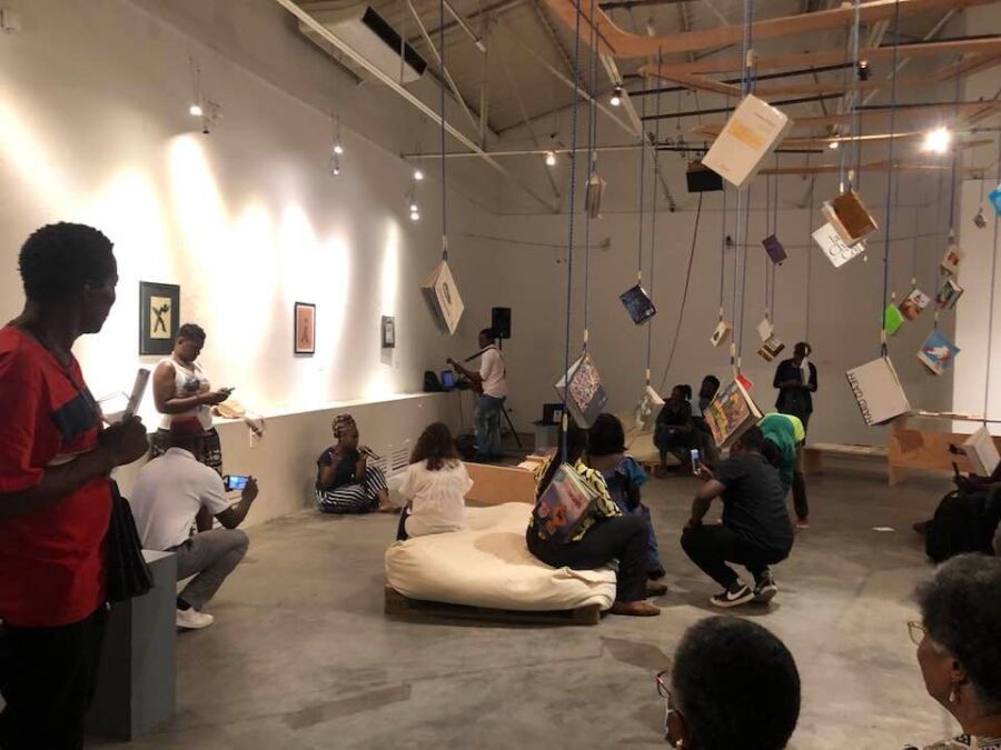 doual’art, a choisi de mettre en avant la particularité de cet artiste en matière de formation. Pour Goddy, être artiste, c’est aussi être porteur de savoirs : Il faut donc se muscler le cerveau à travers la lecture, la recherche, la documentation pour s’imprégner d’imaginaires, se forger une pensée et inventer des concepts pour aller au plus loin de sa création. doual’art nous ouvre les yeux sur cette facette de l’artiste qui n’était connue que de ceux et celles qui ont eu le privilège d’être accueillis en résidence à ArtBakery. Goddy Leye est l’un des artistes pionniers qui a ouvert ses portes à ses jeunes pairs. Il est l’un des rares qui pose le livre comme préalable.