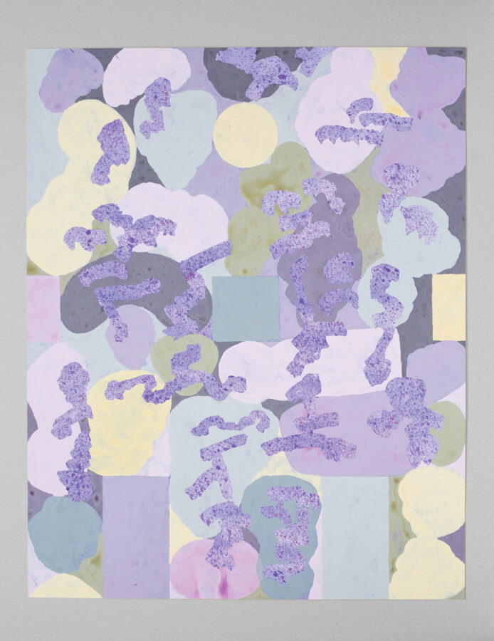 Ensuite, en retirant le drawing gum, la couche inférieure réapparaît : les écritures prises en sandwich dans cette stratification picturale s’apparentent à des taches flottantes, en suspens dans les limbes.