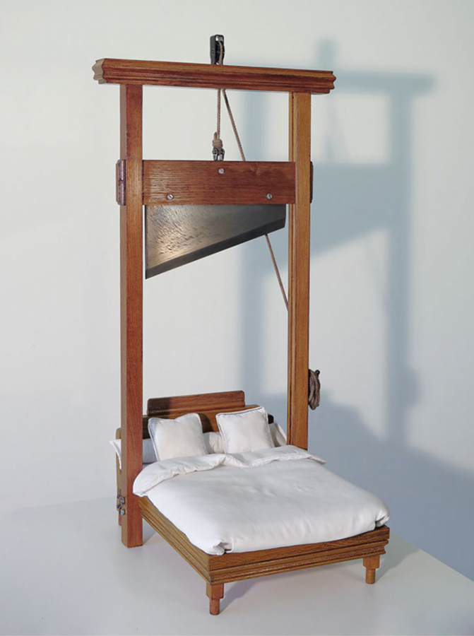Et contempler leur moule nuptial déserté… Le lit-guillotine, promesse et menace à la fois, invite le spectateur au repos, à la chaleur partagée. Surplombant la métaphore rassurante, une lame oblique en conditionne l’accès, exige son tribu de sang. Si la blancheur est transitoire, et la pureté un leurre, la communauté de destin est bien une réalité.