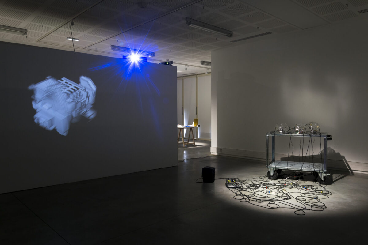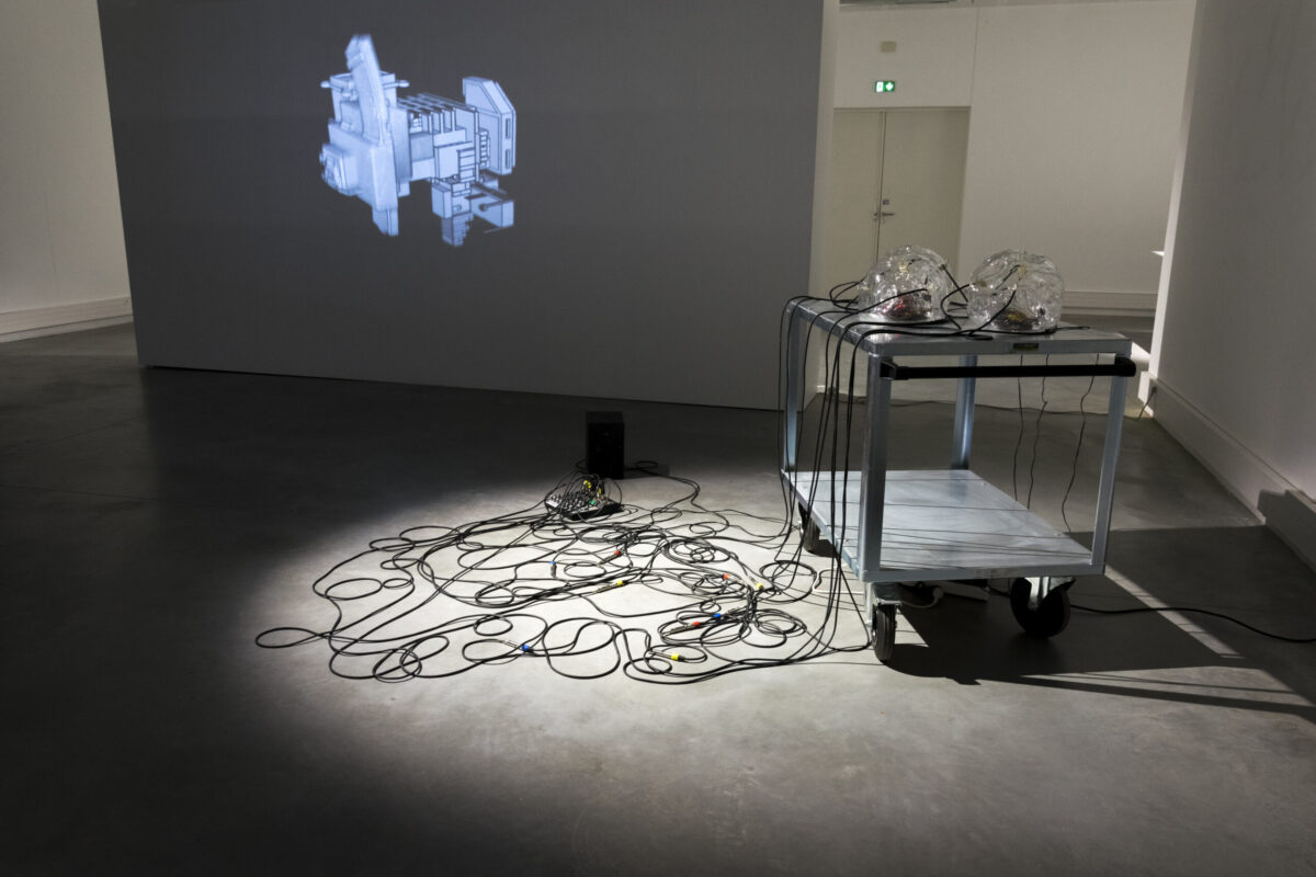 L’ensemble de l’installation évoque une scène science-fictionnelle où l’intervention de l’artiste revient, par l’expérience sonore, à un geste quasi médical. Comme une sorte d’assistance à machine en danger, le procédé maintient les machines défaillantes artificiellement en “Demi-vie”.