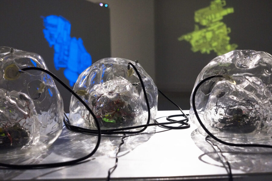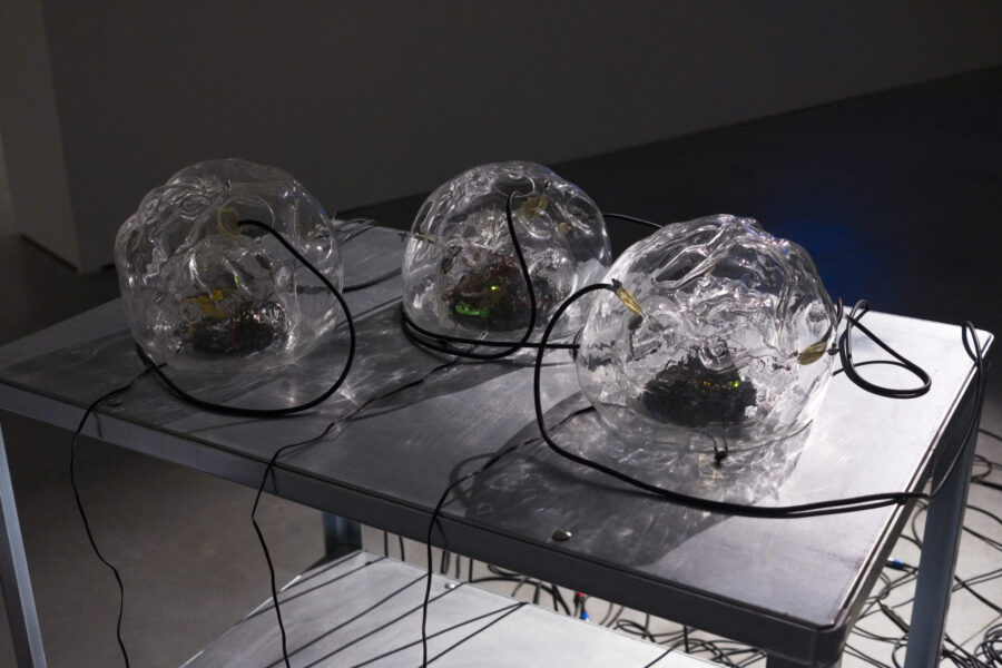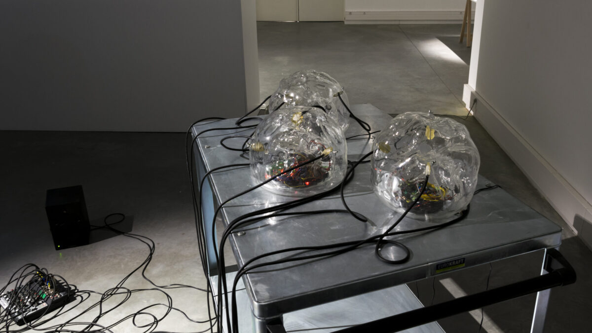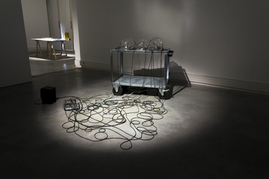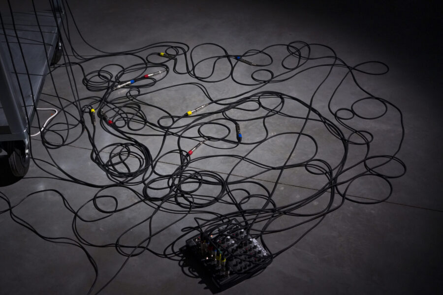 Installation sonore, câbles, verre soufflé, déchets électroniques, haut-parleurs