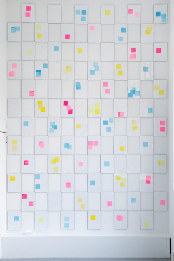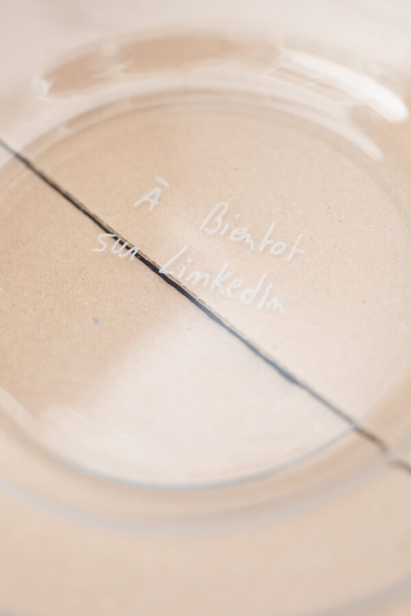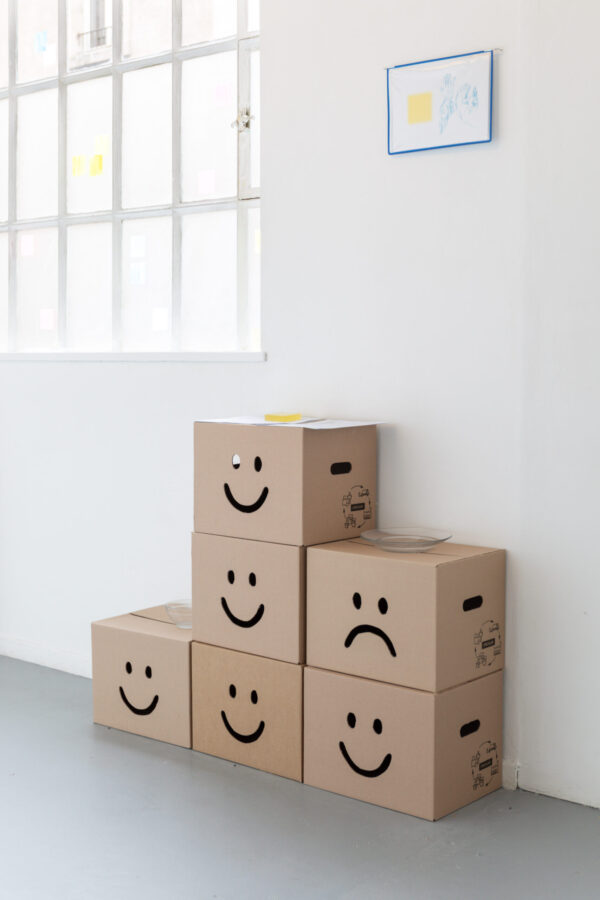 Tout dans l’exposition est précaire, instable, interchangeable. Des dessins au carbone, réalisés d’après des images libres de droit, sont simplement aimantés dans des vitrines d’affichage, prêts à être remplacés. Le verre s’éparpille, évoquant parfois le temps passé, parfois la pression exercée. Un distributeur de gobelets rend visibles les réalités chiffrées du travail. Des cartons, prêts à être évacués, servent encore, le temps d’une soirée, de buffet de fortune. Des modèles de lettres de démission ou de licenciement se déploient au mur. Puis, cadrée dans un accrochage rigoureux, la couleur surgit : des post-it semblant parfois usagés, gravés, deviennent confettis et se répandent jusqu’aux vitres.